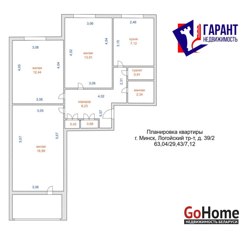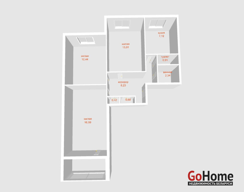 Комнаты 12,44 и 16,99 м2. Большая комната с лоджией.