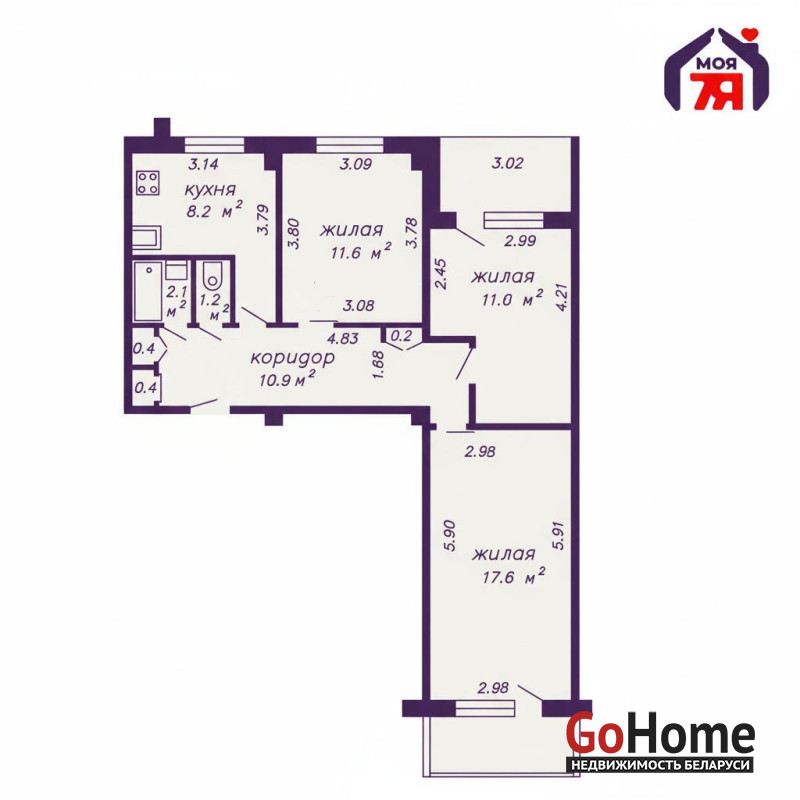 - Три раздельные жилые комнаты, площадью 17,6 м2, 11,6 м2 и 11,0 м2.