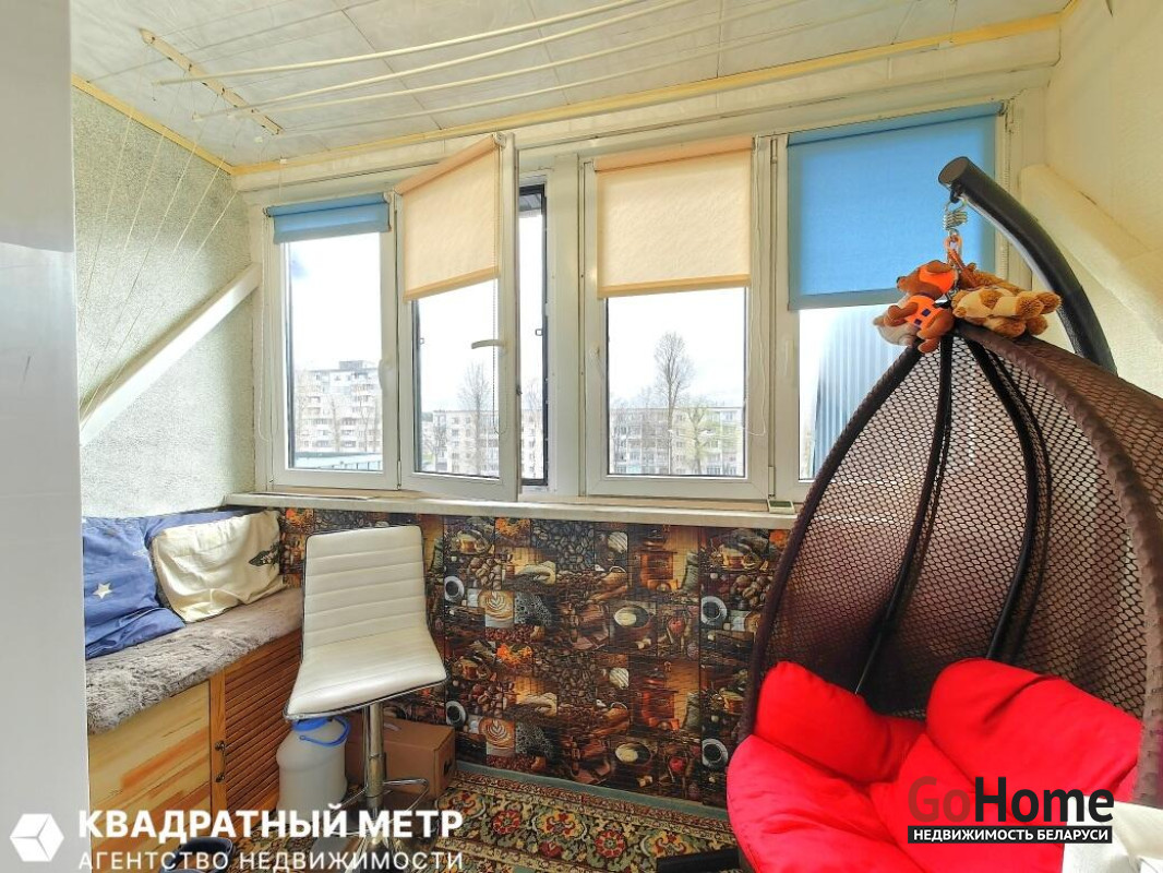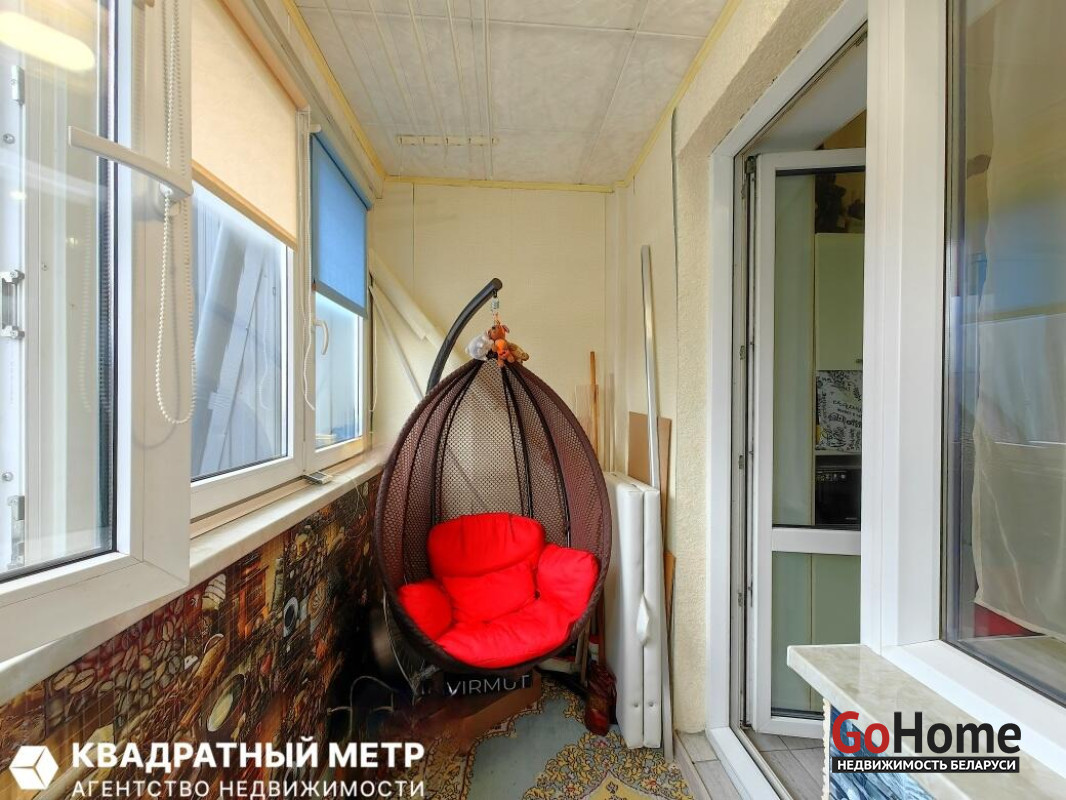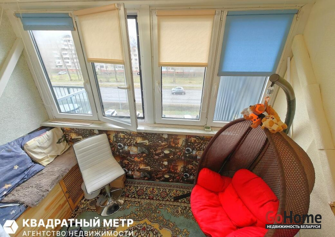 Большая застекленная лоджия площадью 3.8 м.кв. подходит как для посиделок за чашечкой чая, так и для кабинета с личным пространством.