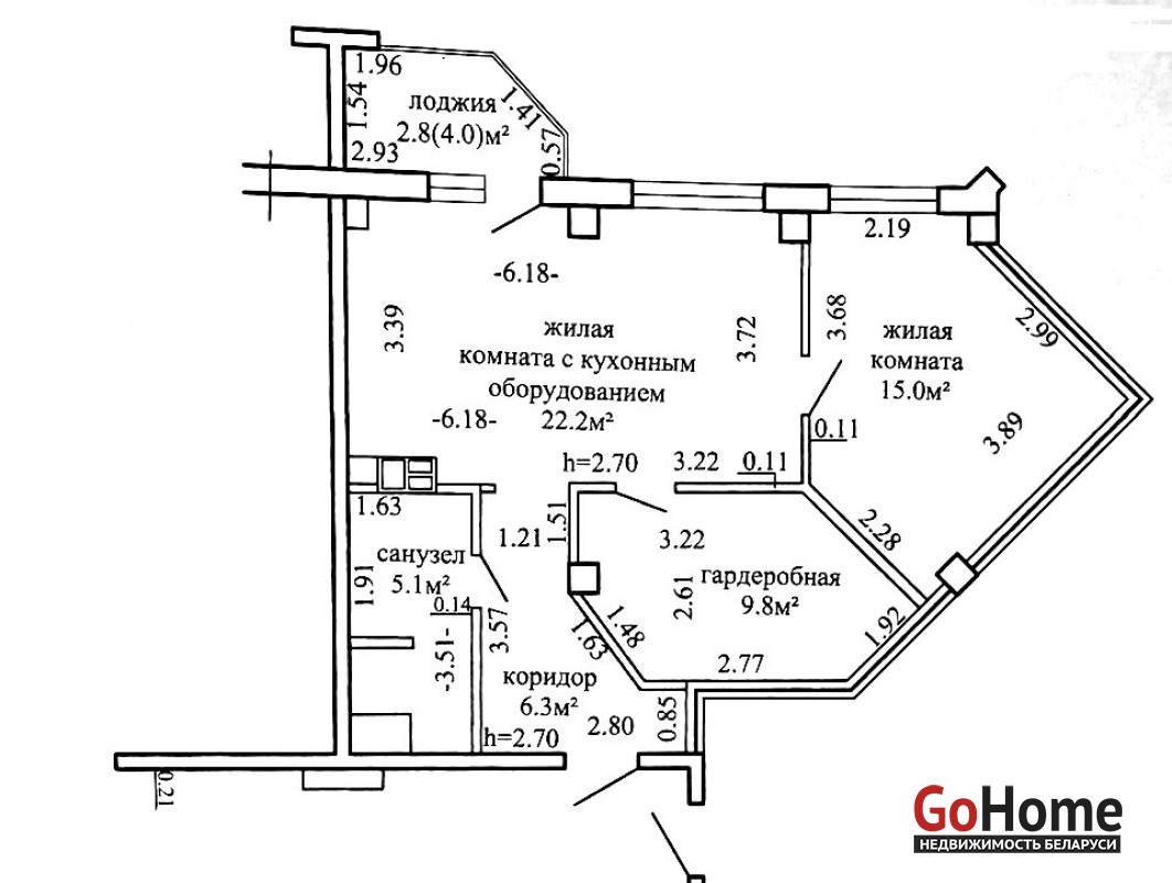 Идеальной планировкой предусмотрено: кухня 22.2 м2 совмещенная с полноценной гостиной и выделенной обеденной зоной, спальные комнаты 15.0 м2, 9.8 м2 , сан.узел 5.1 м2.