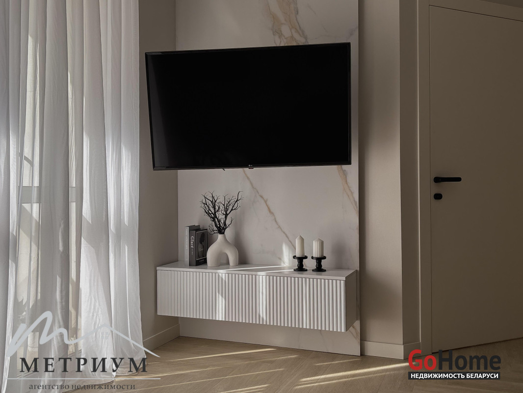 Эстетика: Зона ТВ и кухонный фартук выполнены из роскошного итальянского керамогранита.