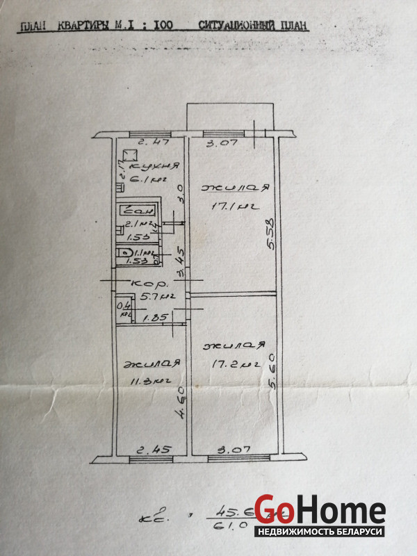 Площадь: жилая 45,6 м², общая 61 м² + балкон 3 м², подвал. Распределение по техпаспорту!