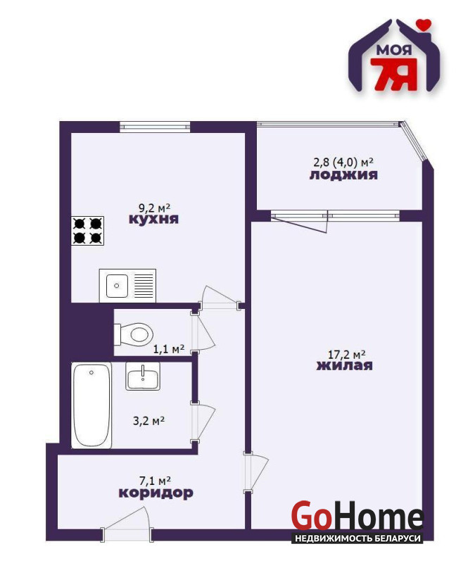 - Общая площадь составляет 40,6 м², жилая - 17,2 м². Кухня - 9,2 кв.м.