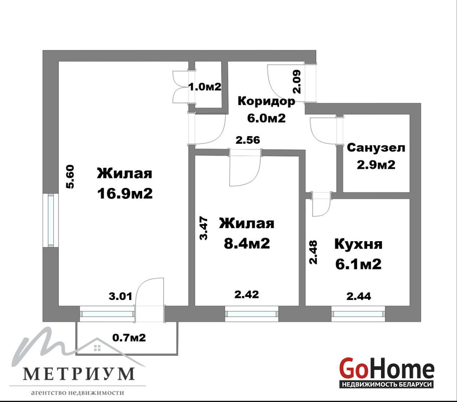 Площадь квартиры по СНБ 42 кв.м/ общая 41.3 кв.м./ жилая 25.3 кв.м./ кухня 6.1 кв.м. Квартира расположена на втором этаже пятиэтажного дома.