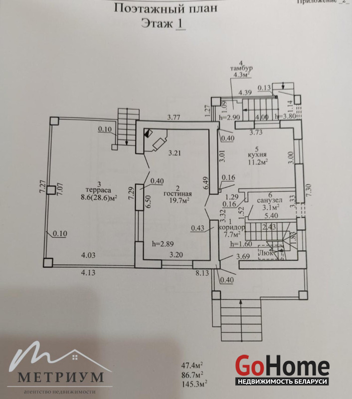 Общая площадь коттеджа 145,3 м2, жилая площадь – 86,7 м2.