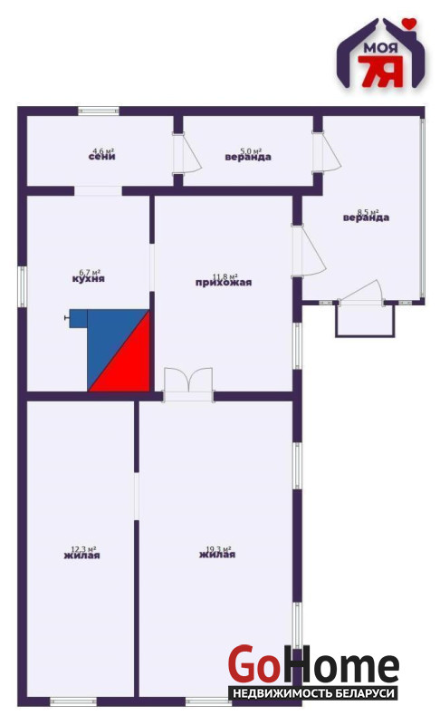 - Дом в аккуратном состоянии, реализована удобная и практичная планировка с организованным пространством и большим количеством естественного освещения: две жилые комнаты (19,3 и 12,3 кв.м.).