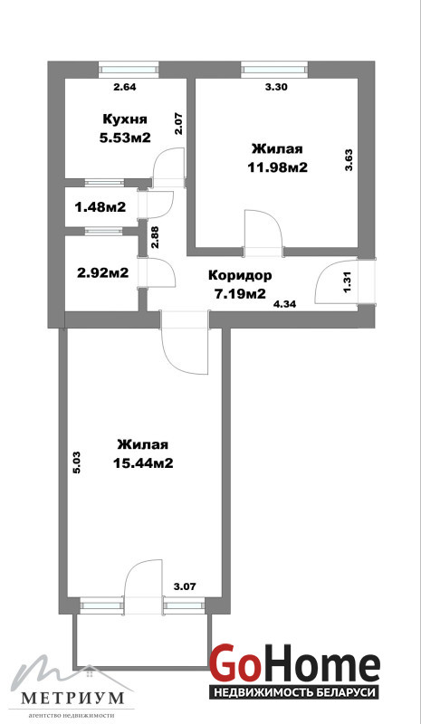 - удачная и функциональная планировка: квартира общей площадью – 44,5 м кв., жилой площадью – 27,4 м кв. включает две просторные изолированные комнаты 15,44 м кв., 11,98 м кв., кухню 5,53 кв. м, коридор 7,19 м кв., раздельный санузел и балкон; кухня при желании может быть объединена с соседней комнатой;