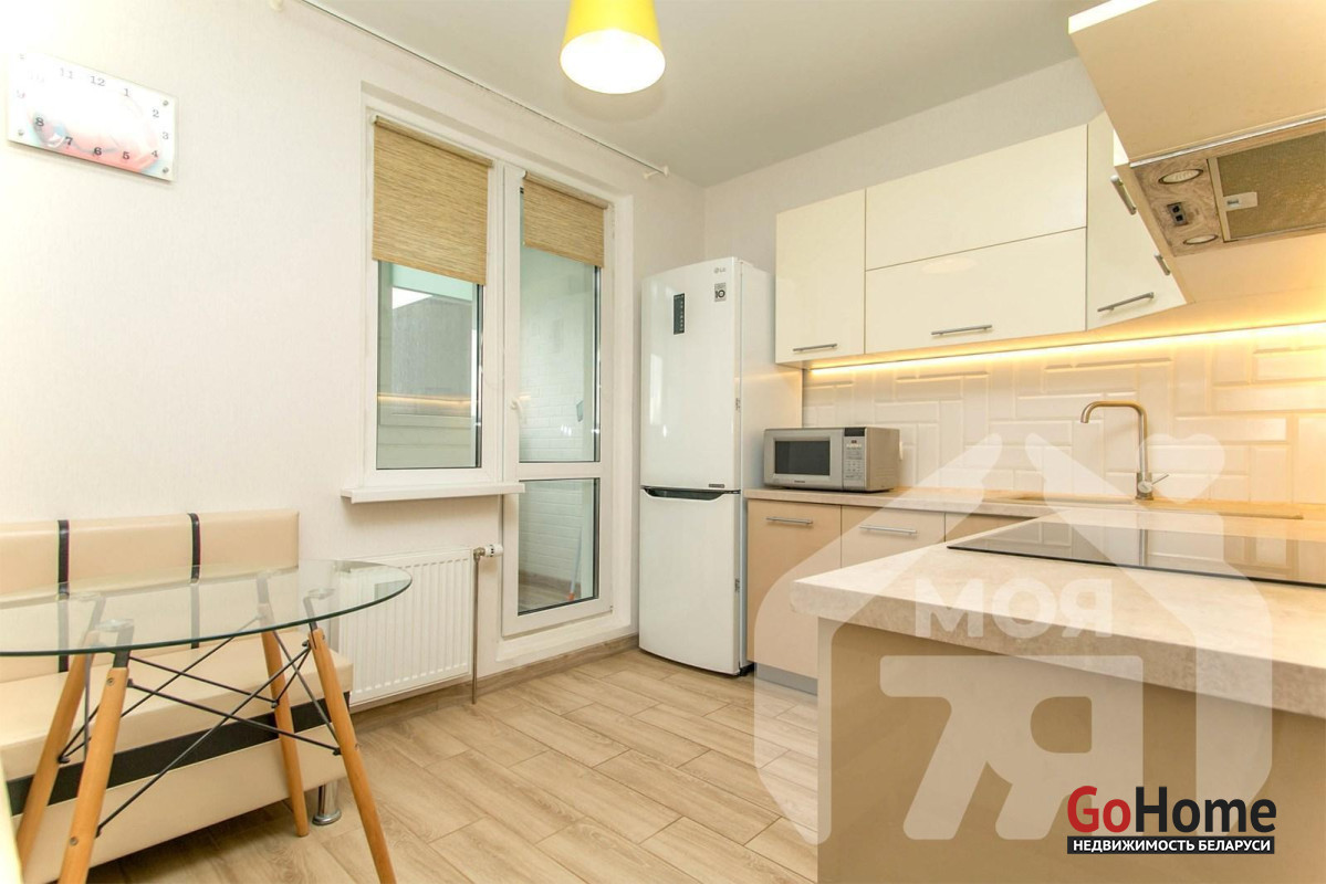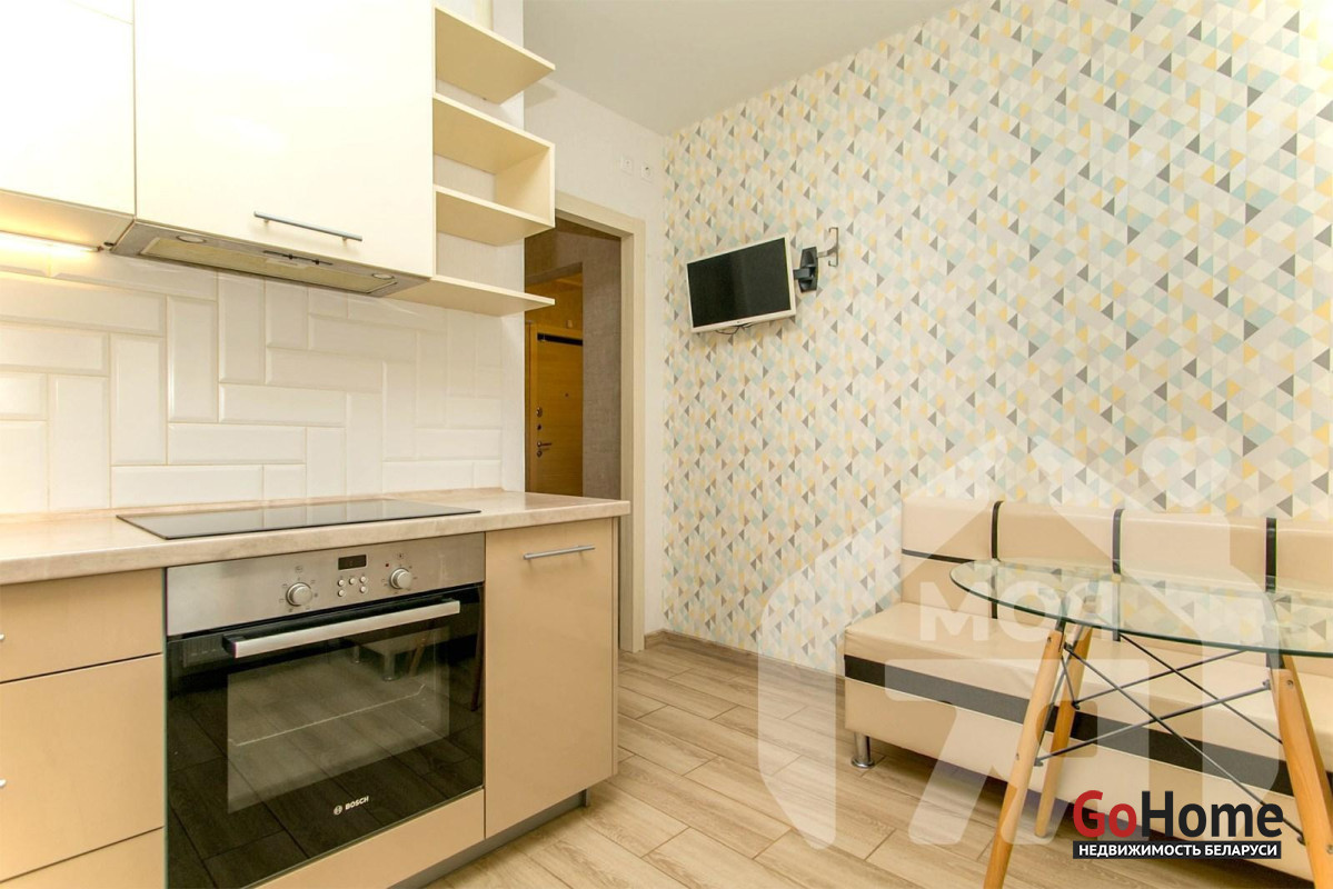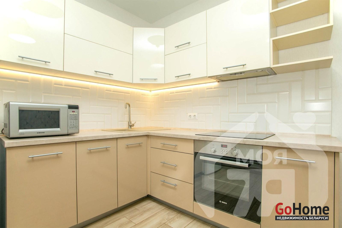 -Кухня площадью 9,3 м2 — просторная, что редко встречается в 1‑комнатных квартирах. Установлен современный кухонный гарнитур со встроеной посудамойкой, вытяжкой, духовым шкафом, а также варочной панелью. Есть место для обеденной зоны — можно завтракать, обедать, принимать гостей. Из кухни прямой выход на лоджию — удобство при готовке, возможность расширить пространство летом.