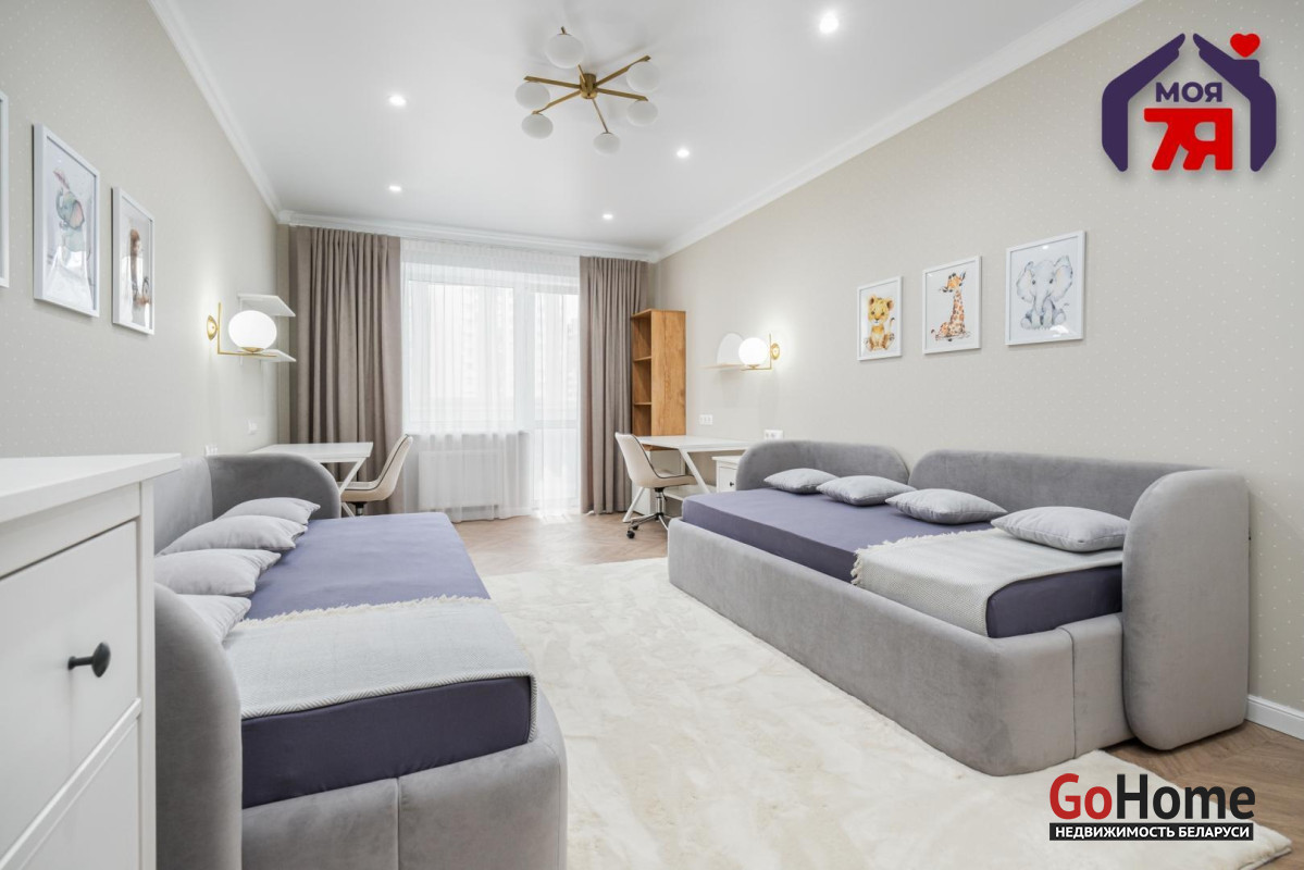 - Для детей предусмотрена просторная комната. Два спальных места, рабочие зоны у окна и лёгкий дизайн обеспечивают условия для учёбы, игр и сна.