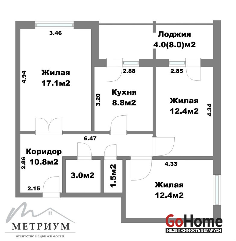 Улучшенная планировка: кухня 8,8 кв.м., 3 большие комнаты, большая лоджия с выходом на кухню и комнату.