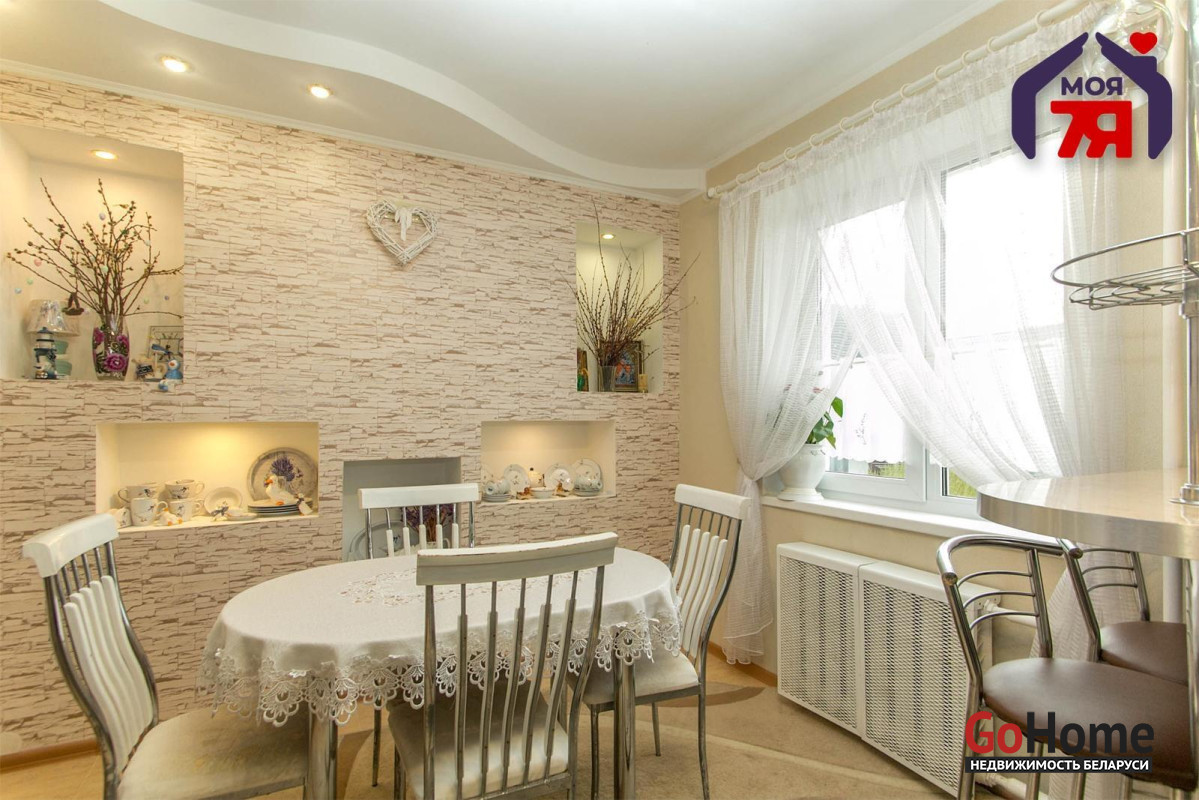 -Кухня площадью 16,7 м2 — просторная. Здесь всё продумано идеально. Современный кухонный гарнитур создает стильный, элегантный интерьер. Встроенная техника — плита, вытяжка - всё на месте и готово к работе. Столешница практичная, легко чистится, долго служит. Освещение над рабочей зоной обеспечивает видимость при готовке, создавая комфорт. Просторная обеденная зона позволяет комфортно завтракать, обедать, ужинать всей семьёй, приглашать гостей.