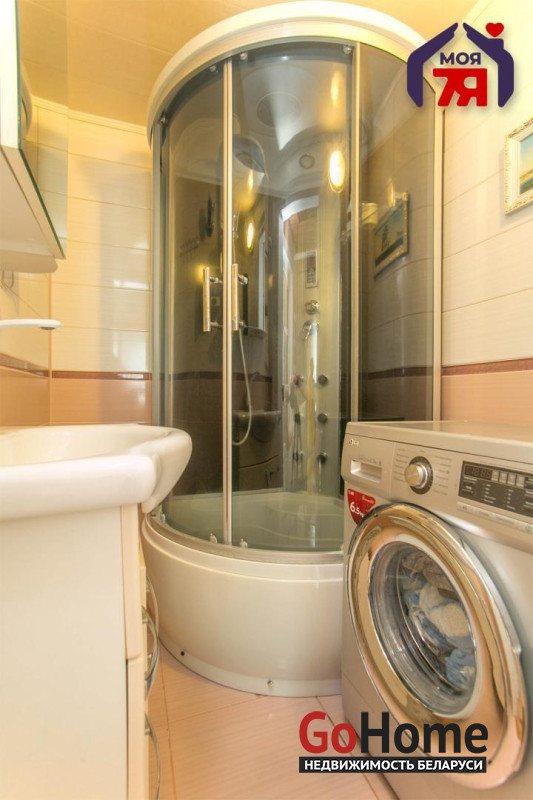 -2 сан.узла создают комфорт и удобство для проживания.Цветовая гамма — бежевые и коричневые тона, создающие гармонию и тепло. Главное украшение — современная душевая кабина с прозрачными стёклами, оборудованная удобной душевой системой, позволяющей комфортно принимать душ.