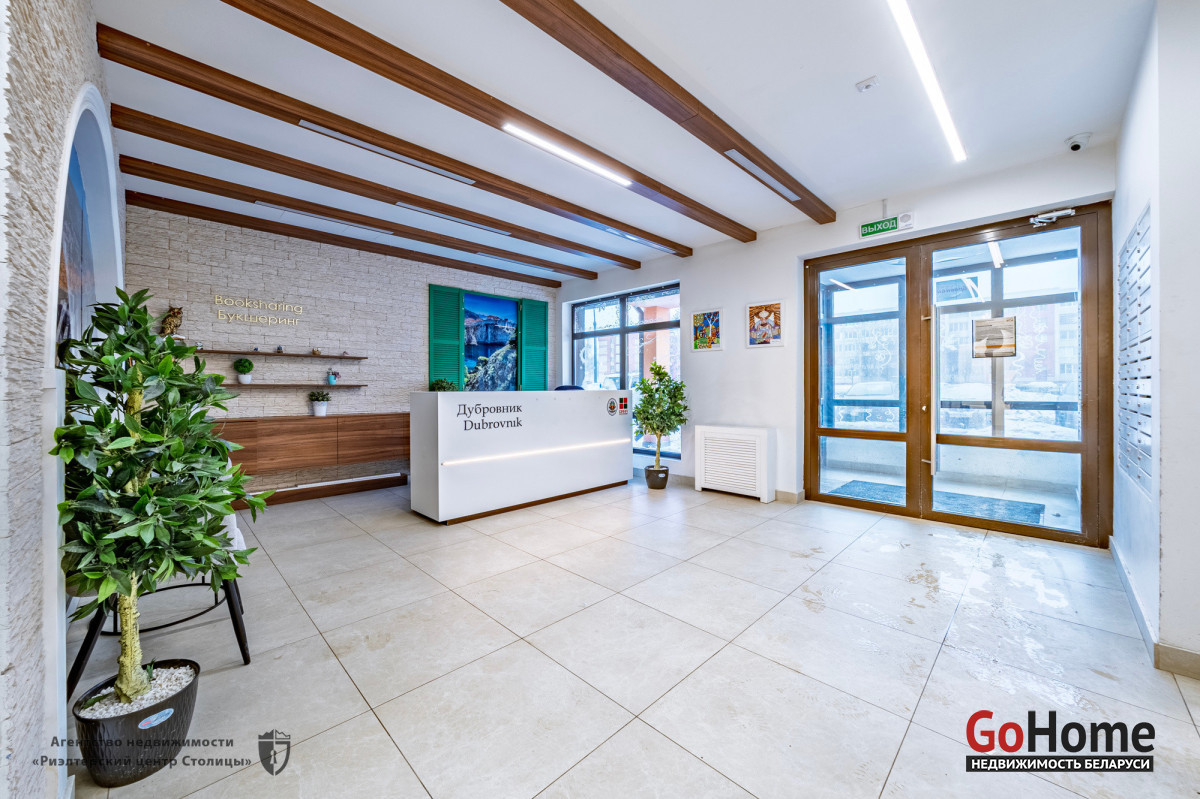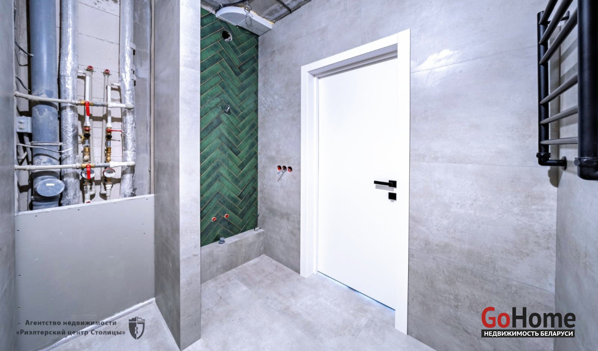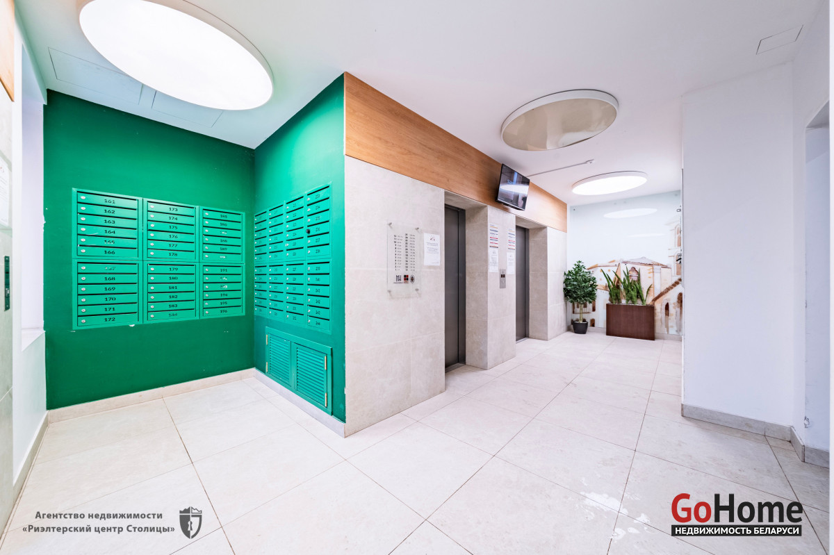 А внизу — просторное лобби: есть холл для гостей, комната матери и ребенка и даже отдельный санузел, где можно ополоснуть велосипед, коляску или помыть лапы питомцу после прогулки.