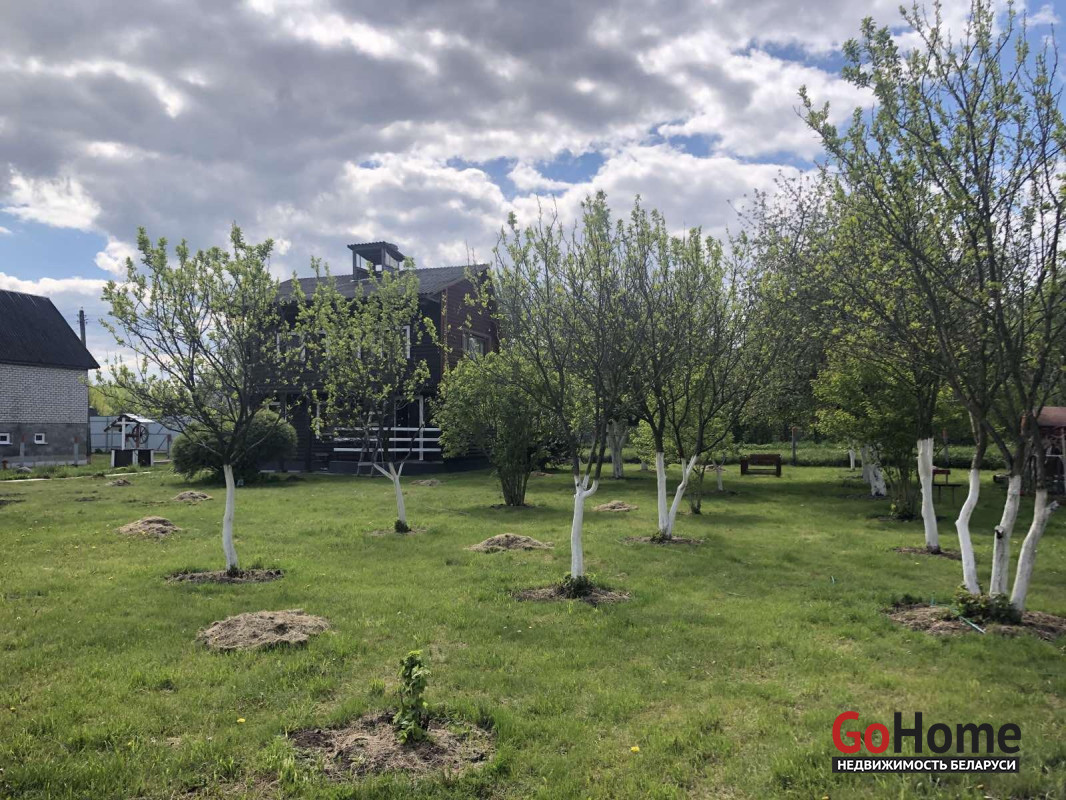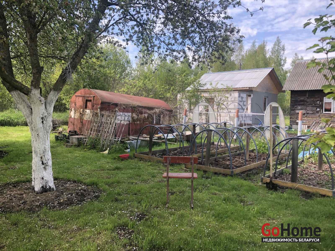 На участке растут плодовые деревья, кустарники и цветы, выделено место под огород. Совсем рядом находится лес и протекает речка.