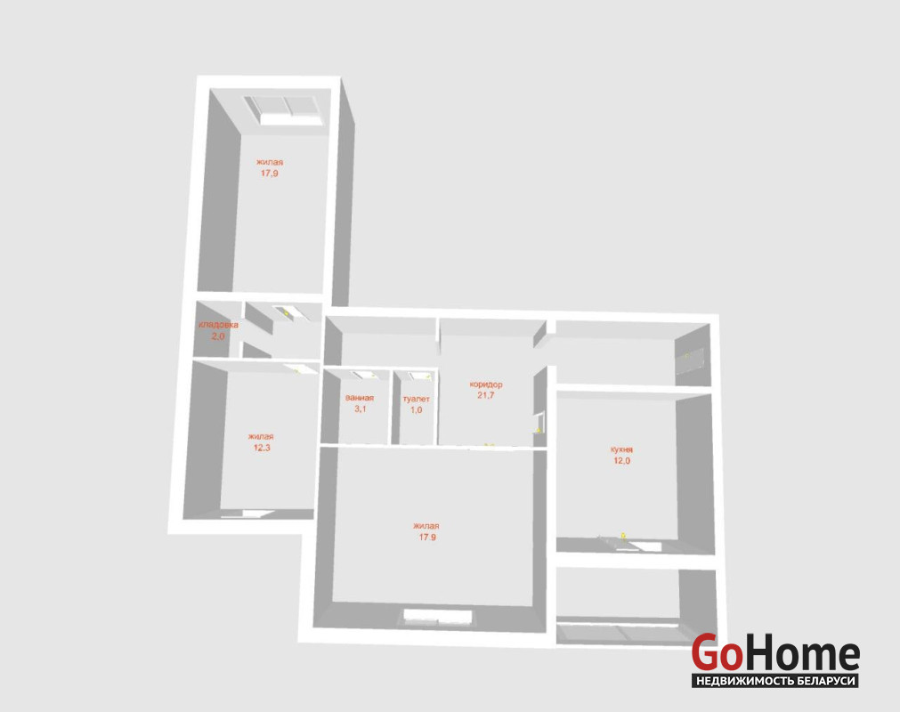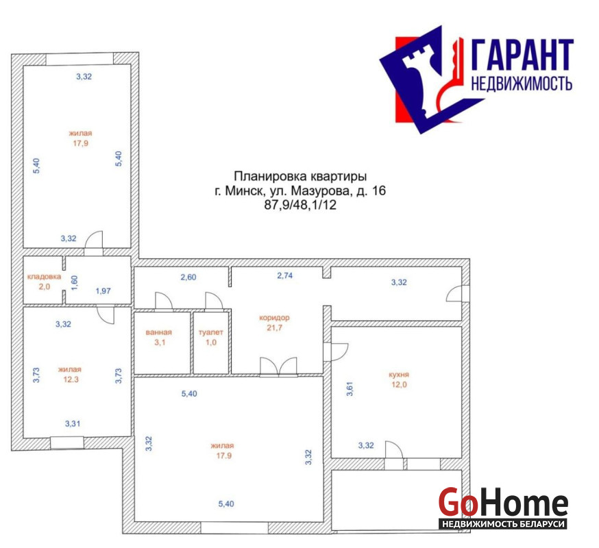 Улучшенная планировка: большая кухня 12 кв.м. с выходом на застекленную лоджию, все изолированные комнаты 17.9 кв.м, и 12,3 кв.м, просторный коридор 21.7 кв.м.