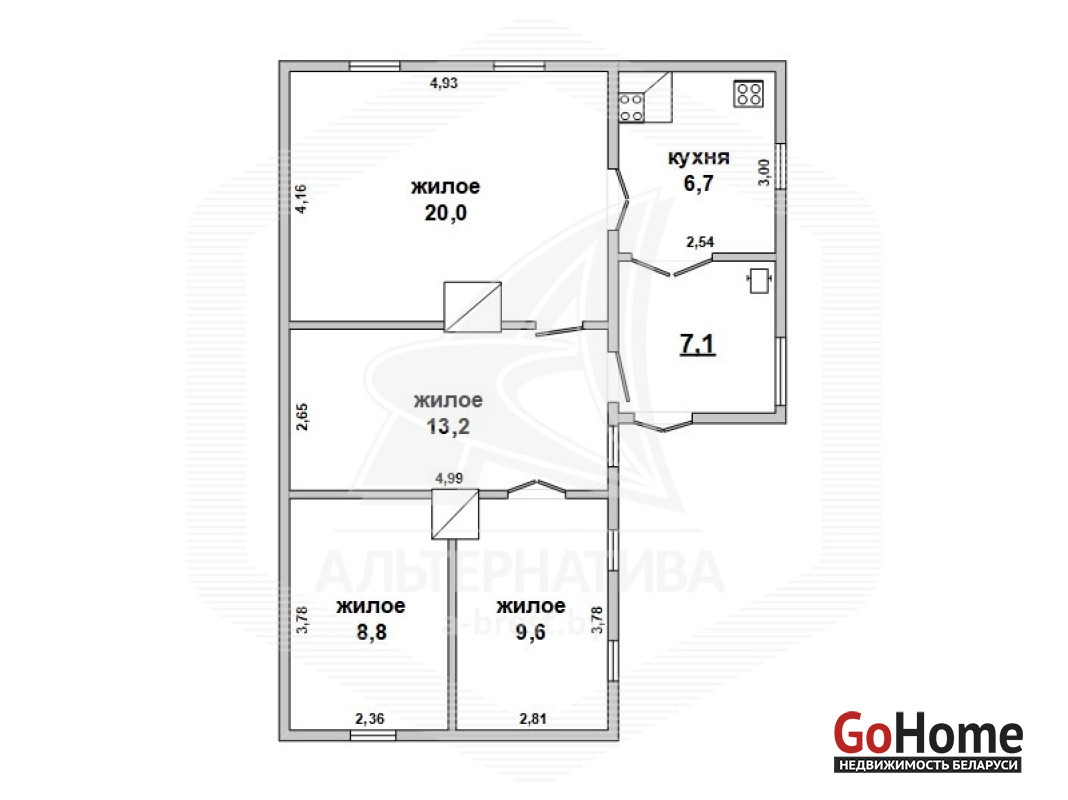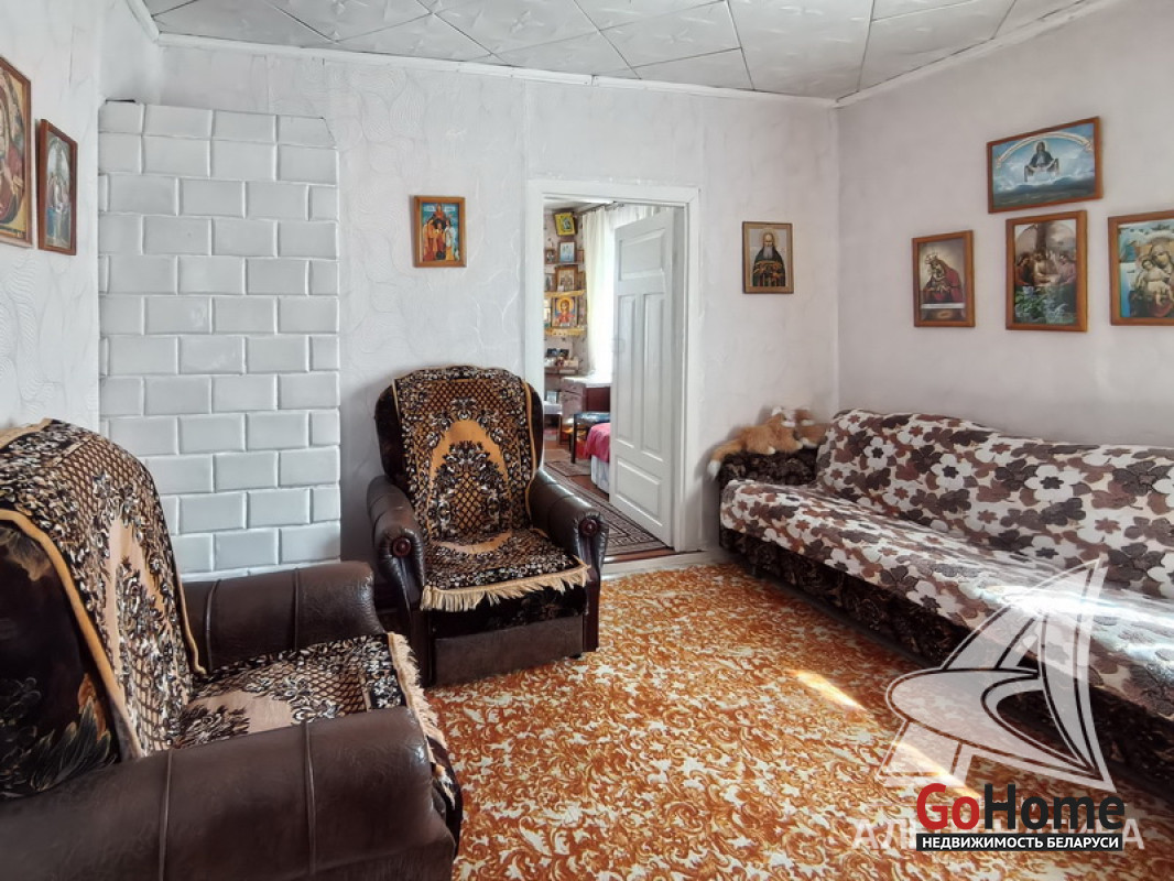 Жилой дом в г.Кобрине. 1900 г.п. 1 этаж. Общ.СНБ - 58,3 кв.м, общ.- 58,3 кв.м, жил.- 51,6 кв.м, кух.- 6,7 кв.м. 3 комнаты, высота потолка - 2,50 м.