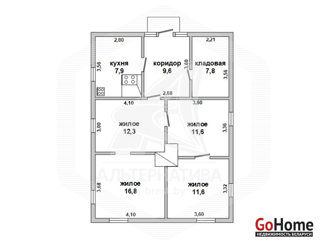 Жилой дом в г.Кобрине. 1 этаж. Общ.СНБ - 58,3 кв.м, общ.- 58,3 кв.м, жил.- 51,6 кв.м, кух.- 7,93 кв.м. 4 комнаты, высота потолка - 2,50 м.