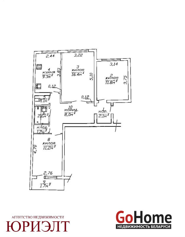 Общая площадь 65.4 м.кв., жилая 39.4 м.кв., кухня 9.3 м.кв.