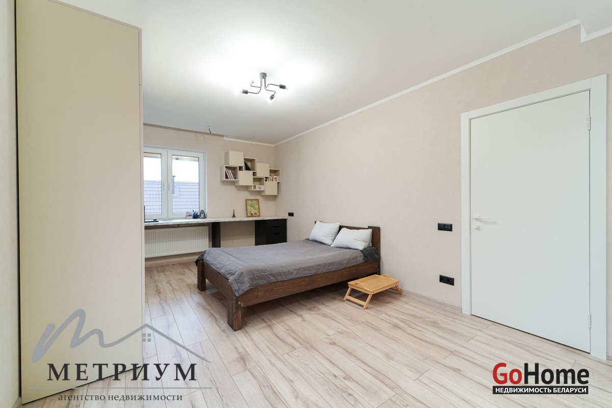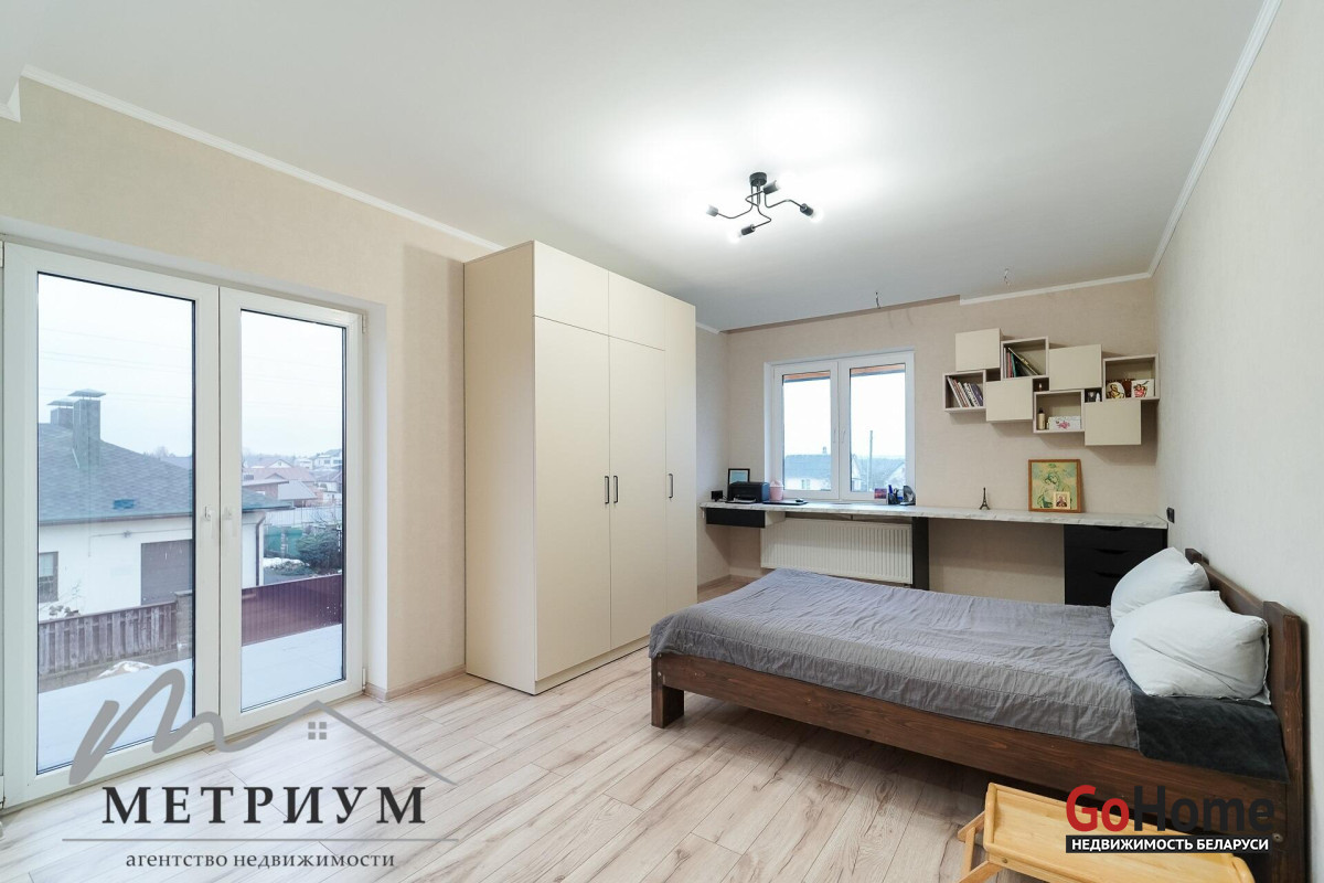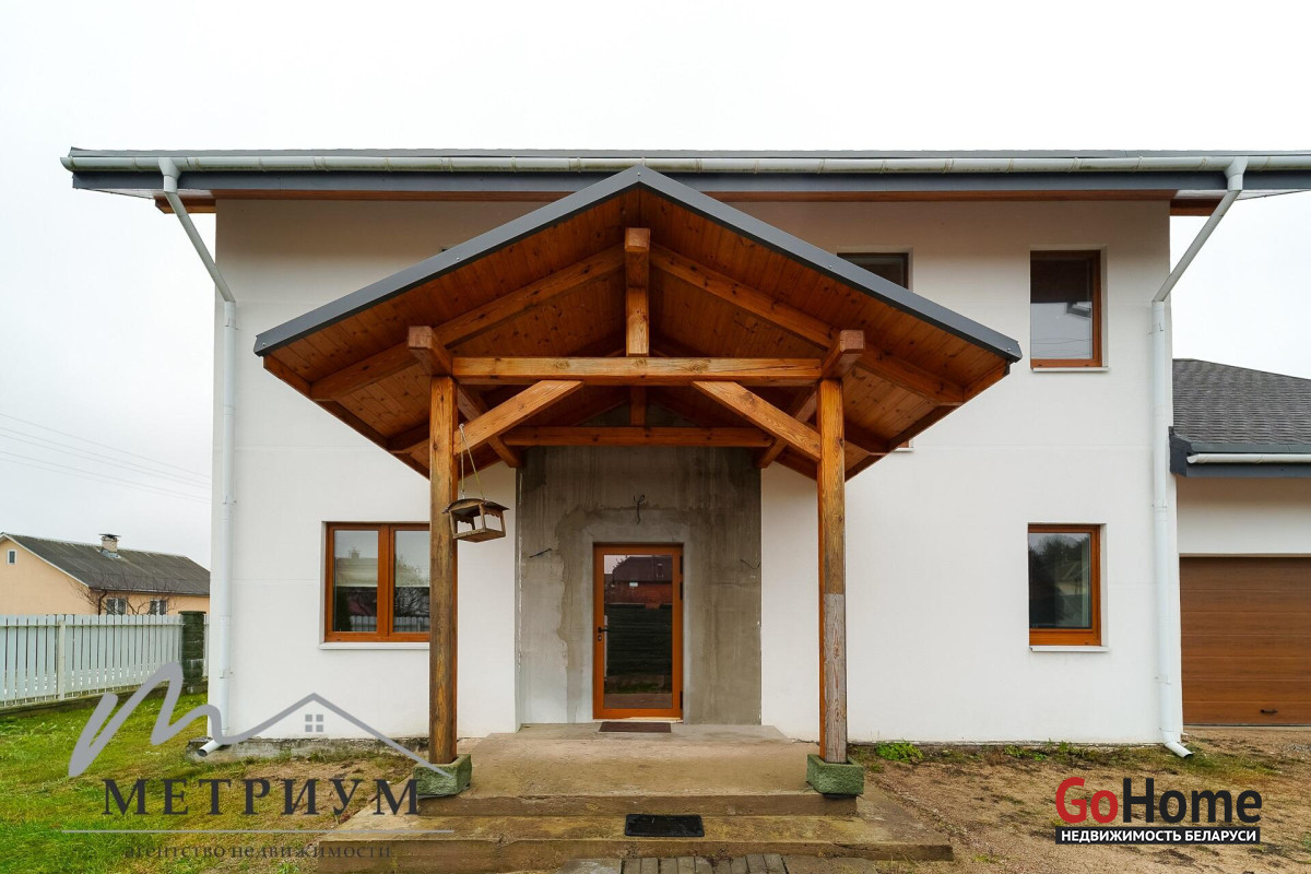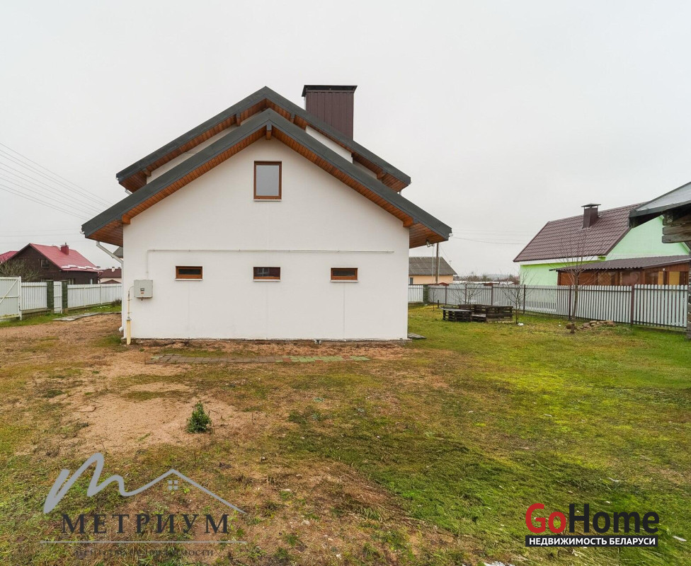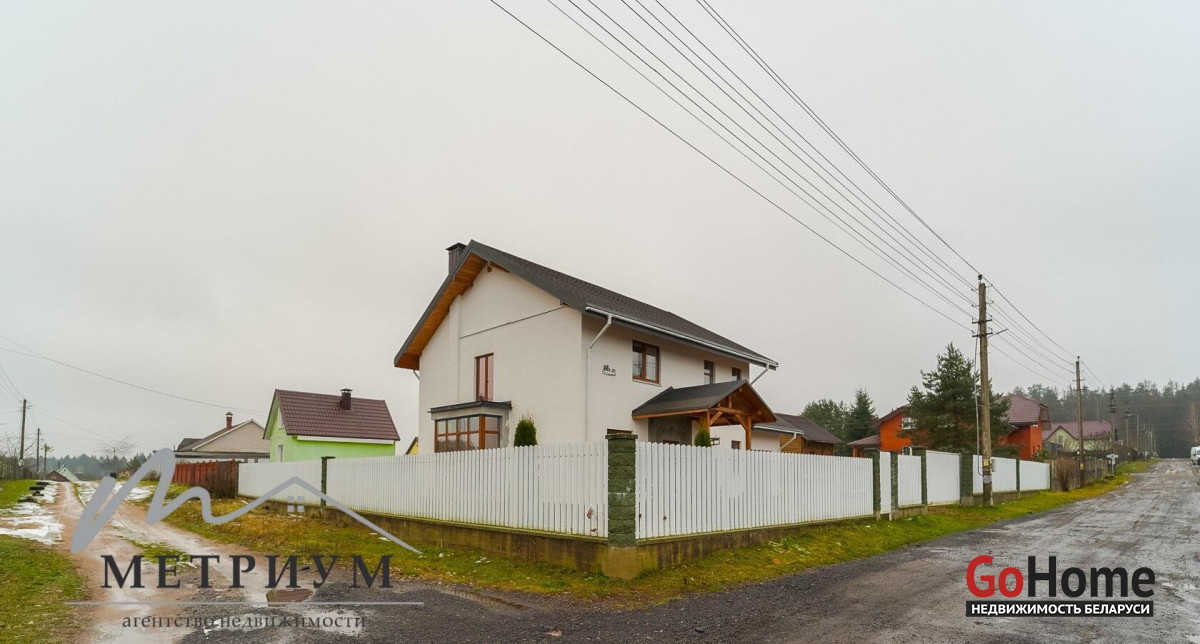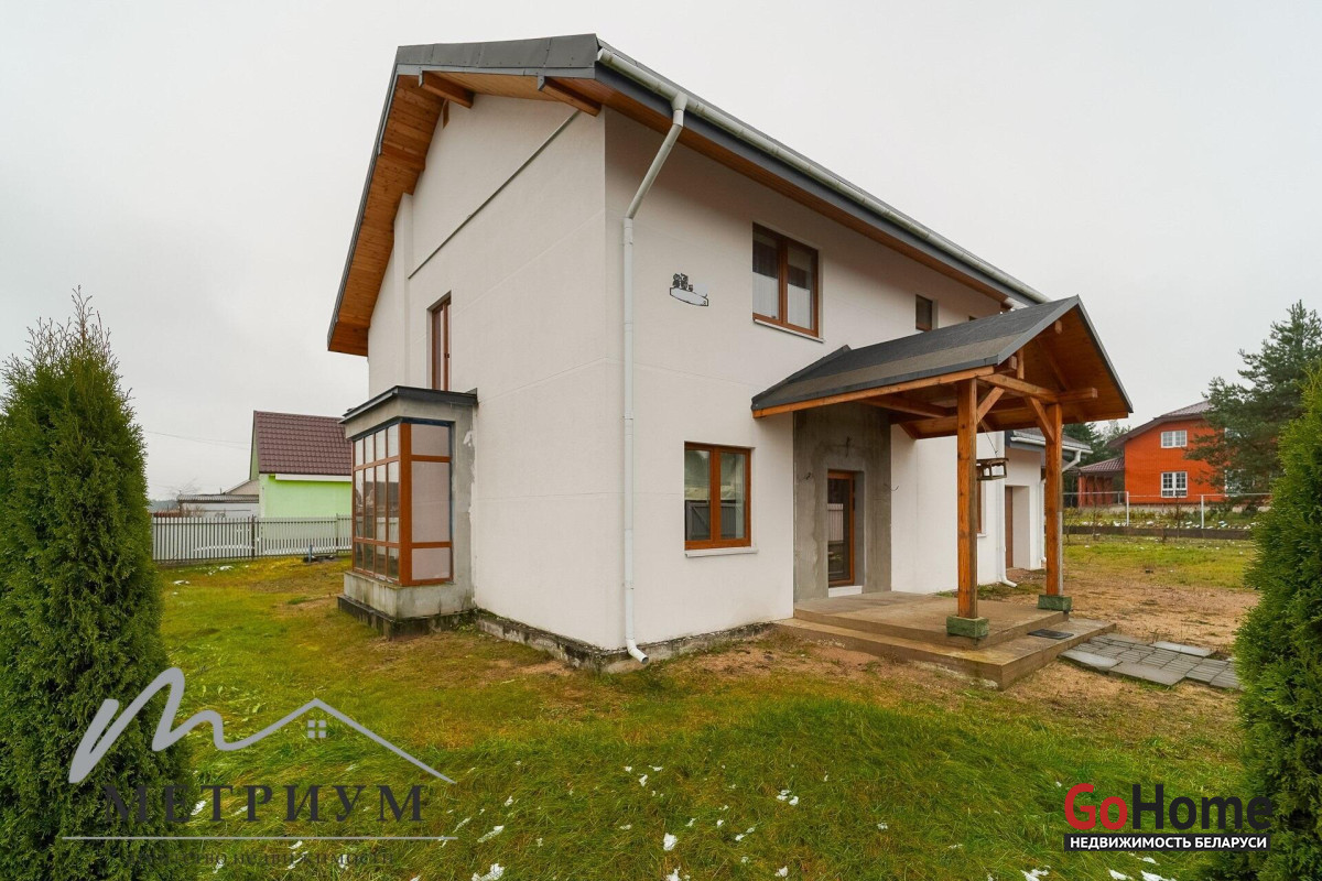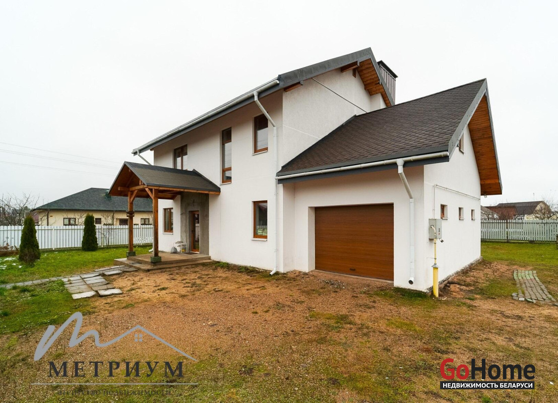 СТ «Ясная поляна. Современный дом, рядом с деревней Юхновка (Московском напр., 18 км от МКАД).Площадь дома по СНБ 230,6 кв.м., Общая площадь 147 кв.м., жилая площадь 96.3 кв.м.При строительстве и отделке были использованы натуральные материалы. Электричество 380 В.Просторная гостиная с выходом на террасу. Светлые жилые комнаты с панорамными окнами "в пол".Просторный гараж примыкает к дому. Потолки высота 2.85 м.Фундамент - утепленная плита. Материал стен - газосиликатный блок, утеплитель - мин.вата фасадная. Кровля – гибкая черепица "Katepal". Газ центральный, вода (центральная от круглогодичной скважины СТ). Канализация местная.Отопление на первом этаже: радиаторы + теплый пол, на втором радиаторы.В проекте дома предусмотрена возможность установки дровяного камина.Участок 10 соток в частной собственности, на котором расположена баня. Отличное транспортное сообщение. - Хорошая дорога до дома по трассе Минск-Москва, 15 минут до микрорайона Уручье.Пригородные автобусы доМинска - 20 минут, регулярное сообщение.- До ж/д станции "Городище" 3км.