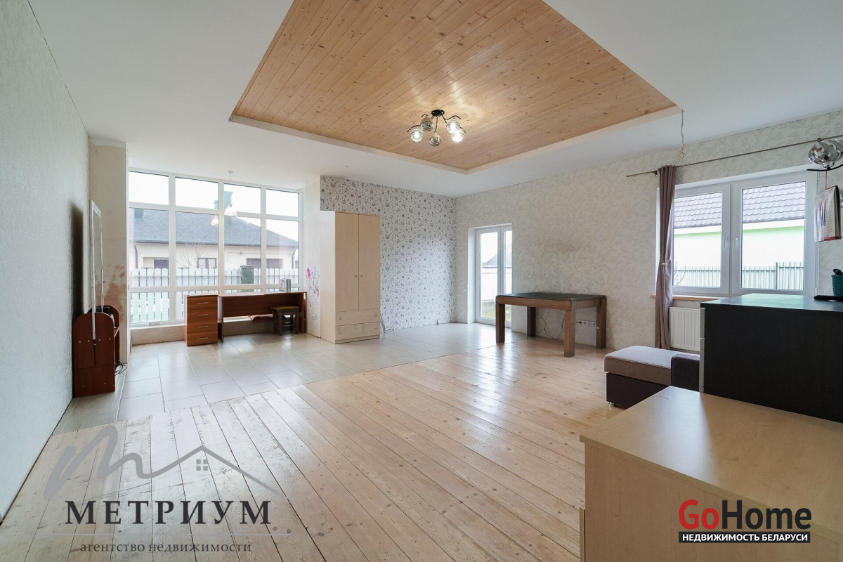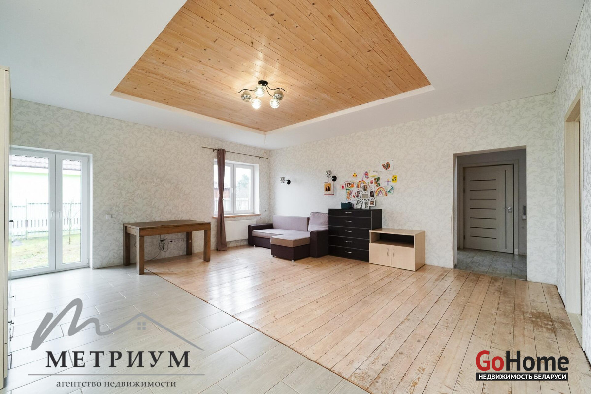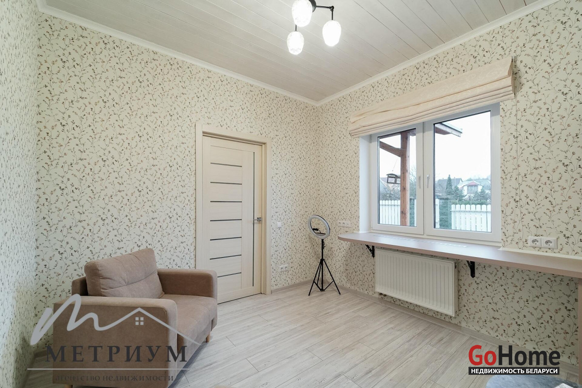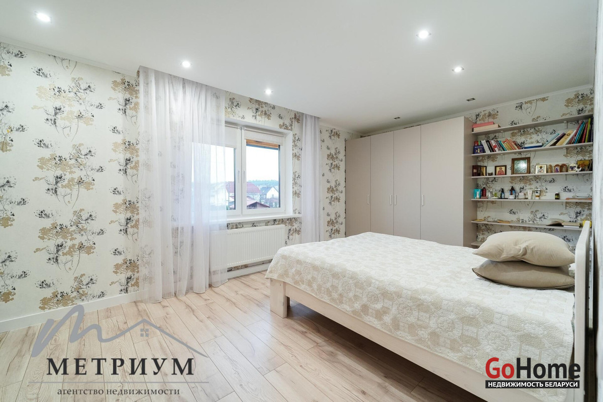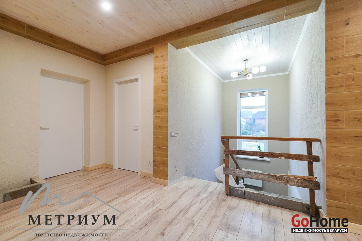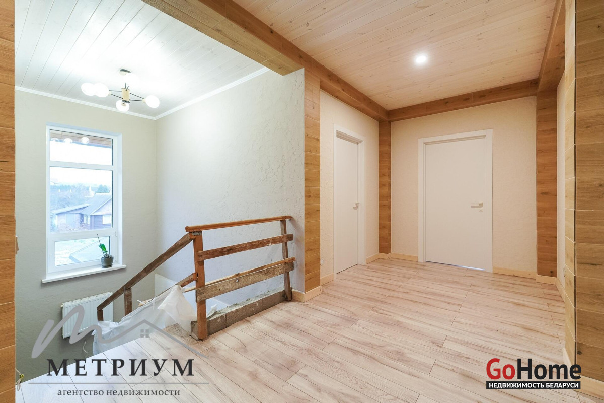 СТ «Ясная поляна. Современный дом, рядом с деревней Юхновка (Московском напр., 18 км от МКАД).Площадь дома по СНБ 230,6 кв.м., Общая площадь 147 кв.м., жилая площадь 96.3 кв.м.При строительстве и отделке были использованы натуральные материалы. Электричество 380 В.Просторная гостиная с выходом на террасу. Светлые жилые комнаты с панорамными окнами "в пол".Просторный гараж примыкает к дому. Потолки высота 2.85 м.Фундамент - утепленная плита. Материал стен - газосиликатный блок, утеплитель - мин.вата фасадная. Кровля – гибкая черепица "Katepal". Газ центральный, вода (центральная от круглогодичной скважины СТ). Канализация местная.Отопление на первом этаже: радиаторы + теплый пол, на втором радиаторы.В проекте дома предусмотрена возможность установки дровяного камина.Участок 10 соток в частной собственности, на котором расположена баня. Отличное транспортное сообщение. - Хорошая дорога до дома по трассе Минск-Москва, 15 минут до микрорайона Уручье.Пригородные автобусы доМинска - 20 минут, регулярное сообщение.- До ж/д станции "Городище" 3км.