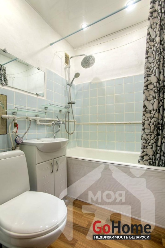 -Санузел совмещённый, оформлен практично. Облицован плиткой, сделан натяжной потолок со встроенными светильниками.