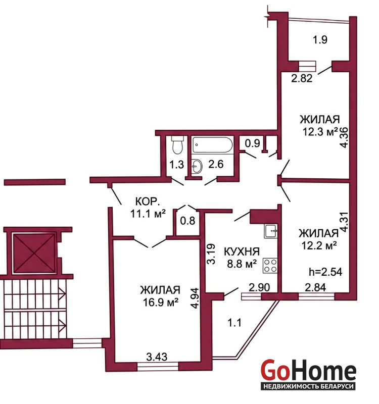 Гостиная 16,9 м2 и две комнаты 12,3м2 и 12,2 м2