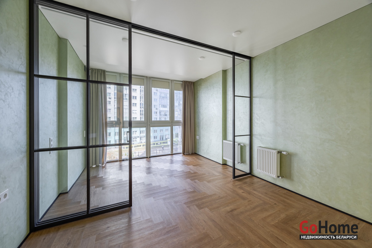 Жилые комнаты: 4 раздельные (18.6, 10, 10 и 43.7 м² — гостиная-кухня с раздвижными стеклянными перегородками).