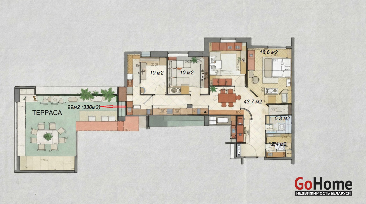 Терраса 99 м² (фактически — 330 м²!) с отдельным входом. Можно установить закрытые/открытые конструкции для отдыха круглый год.