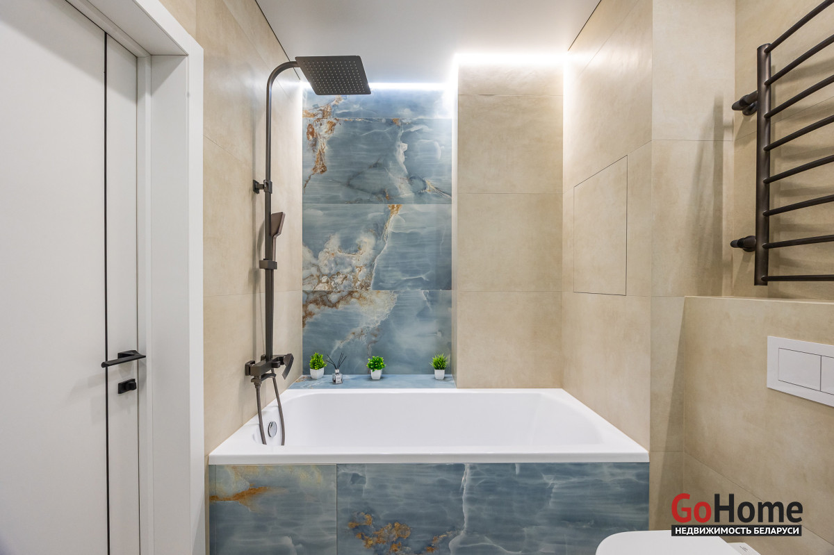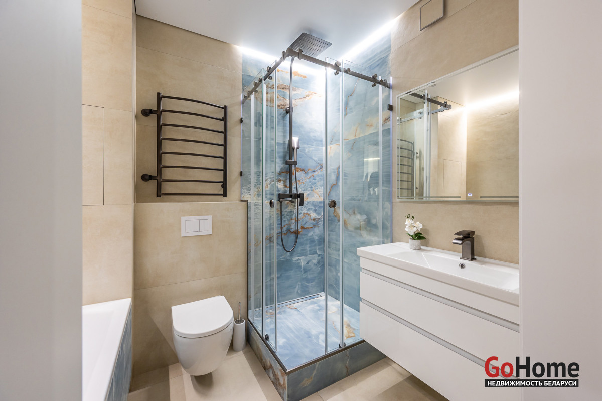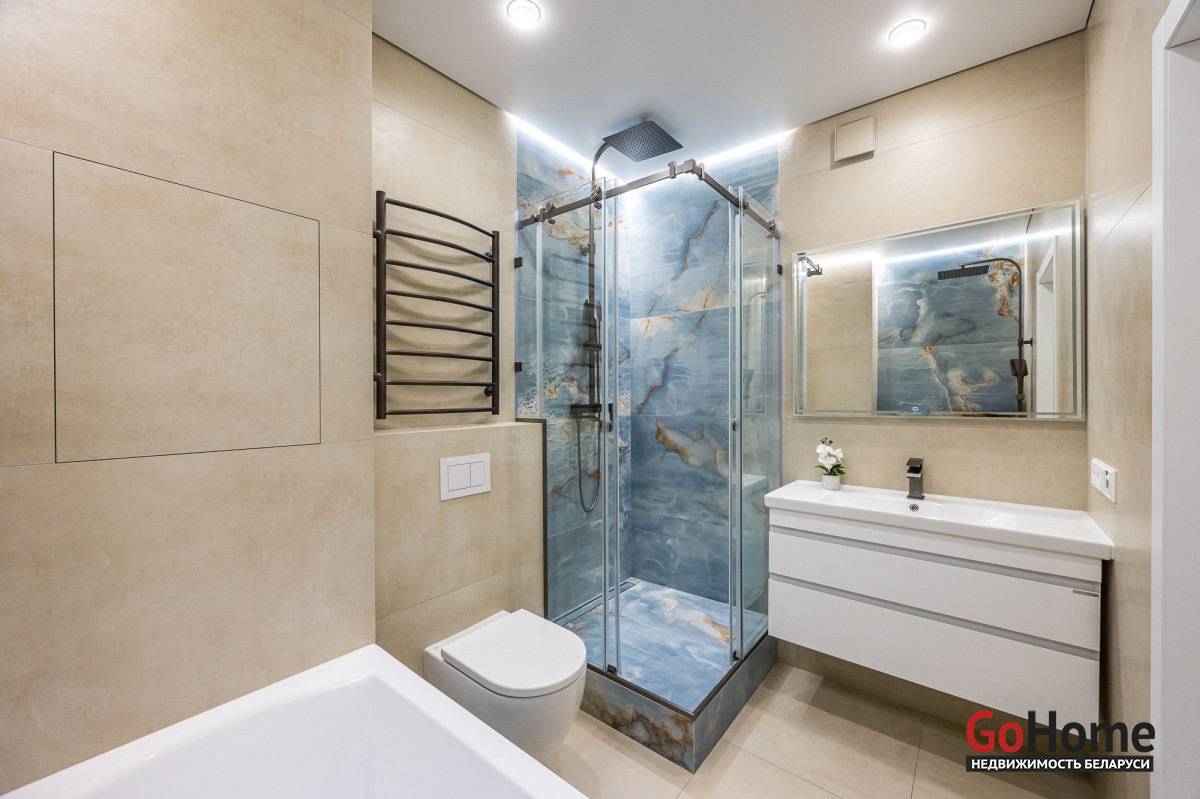 Сантехника высокого класса, тёплые полы по всей квартире.