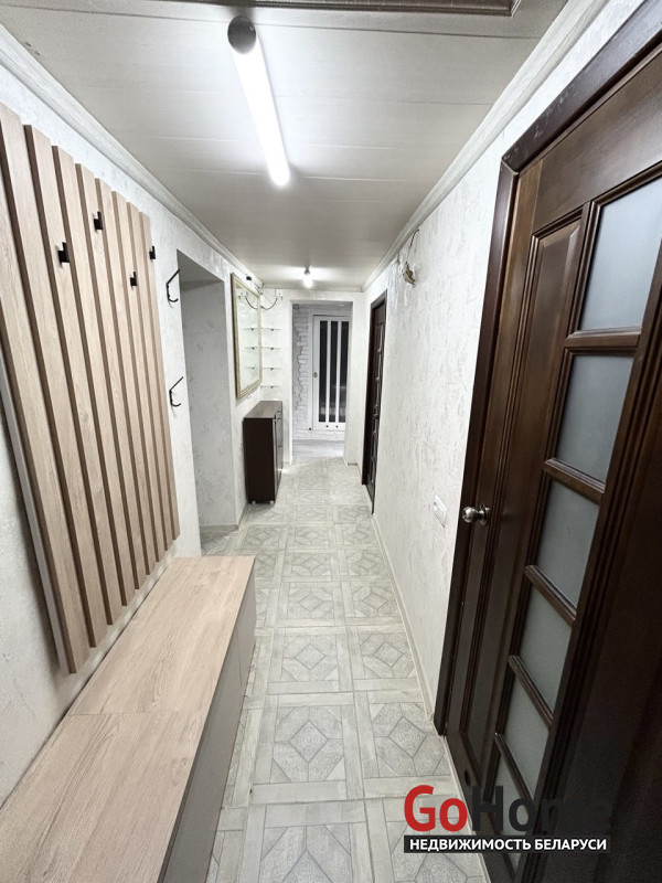 Пол в квартире – ламинат, в прихожей, веранде и коридоре - плитка. Стены – оклеены обоями, в кухне – декоративная штукатурка/ламинат. Два совмещенных санузла. Окна – стеклопакеты ПВХ. Металлические входные двери, межкомнатные двери в одном стиле. Из кухни имеется второй выход на улицу.