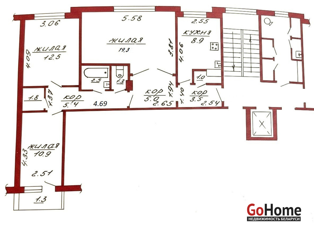 Планировка: три комнаты (две комнаты 12.5 и 10.9м2 — на разные стороны, одна большая - 19,3м2).