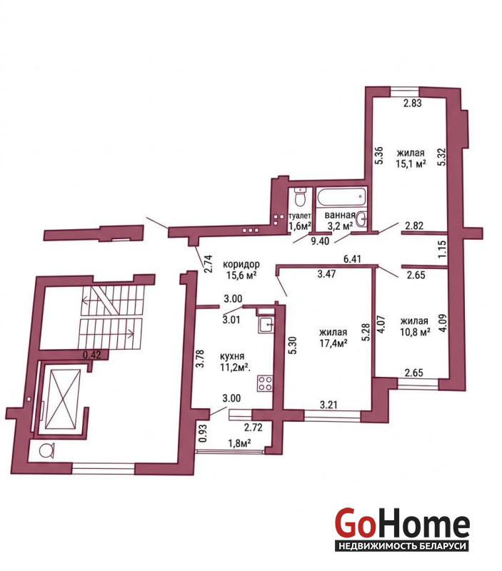 Площадь квартиры общая 74,9 м2, жилая 43,3 м2, кухня 11,2 м2.