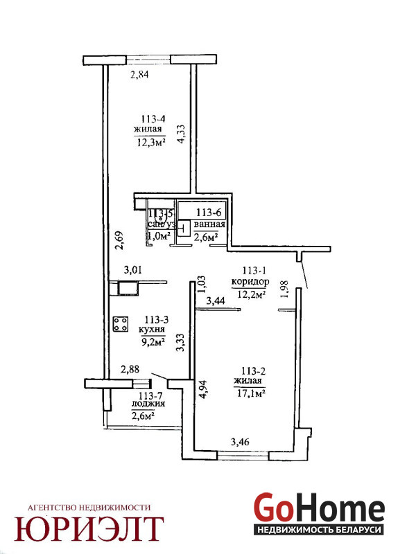 Квартира общей площадью 54,4 кв. м (+ 2,6 кв. м. застеклённая лоджия). (см. фото тех. паспорта).