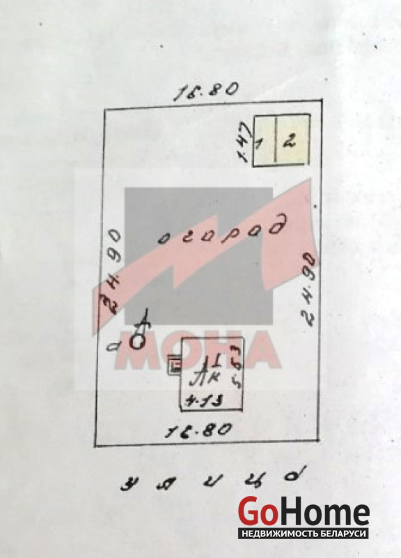 Участок правильной формы размером 0,0418 га, форма собственности частная. Есть оборудованный кирпичный сарай, хороший уличный туалет.