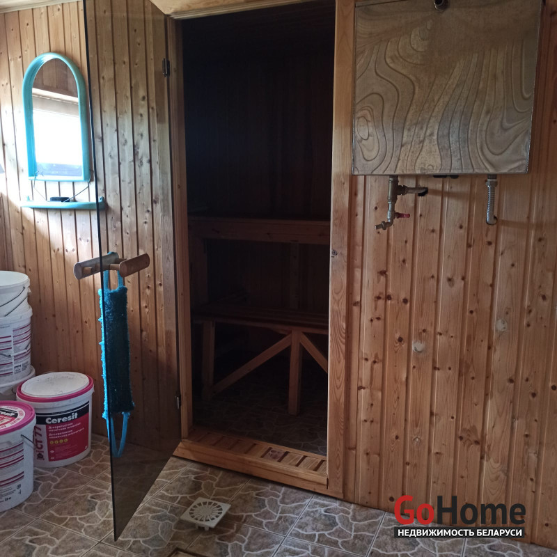Баня финская полность готова к использования, есть гостевая комната, погреб, дверь металлическая.