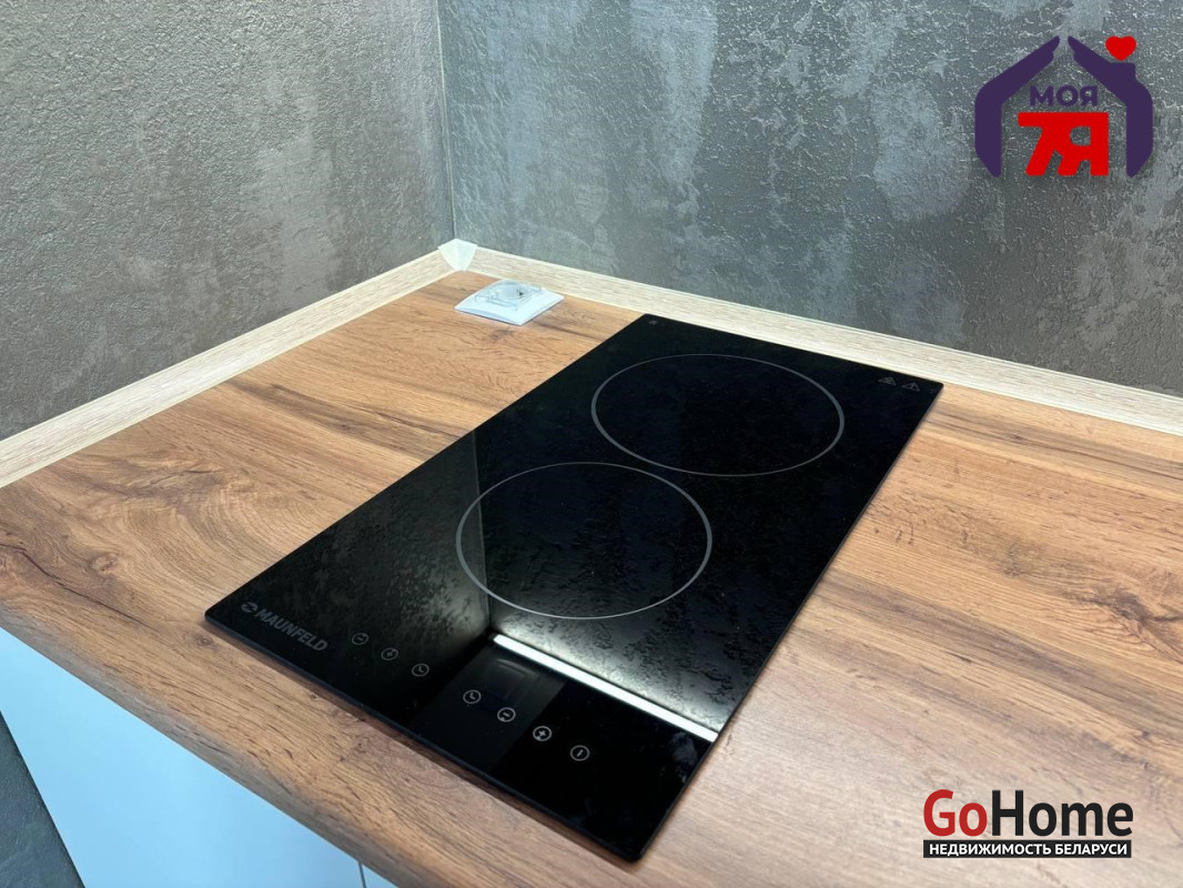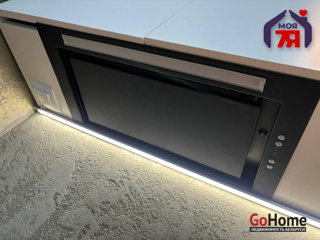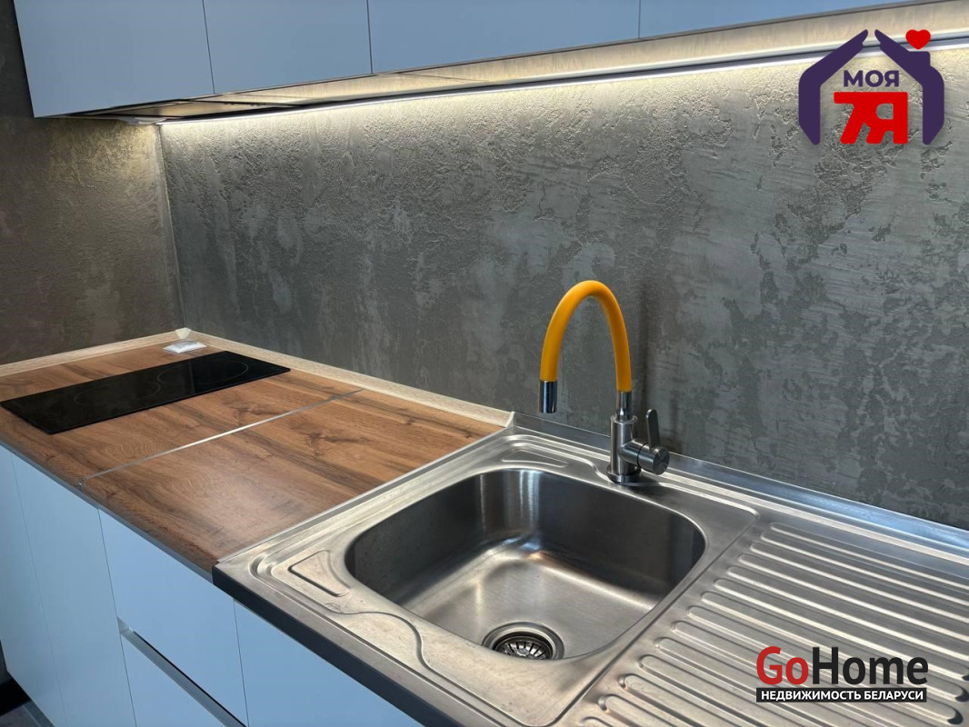 - В квартире установлен кухонный гарнитур с индукционный варочной поверхностью и вытяжкой, мойкой.