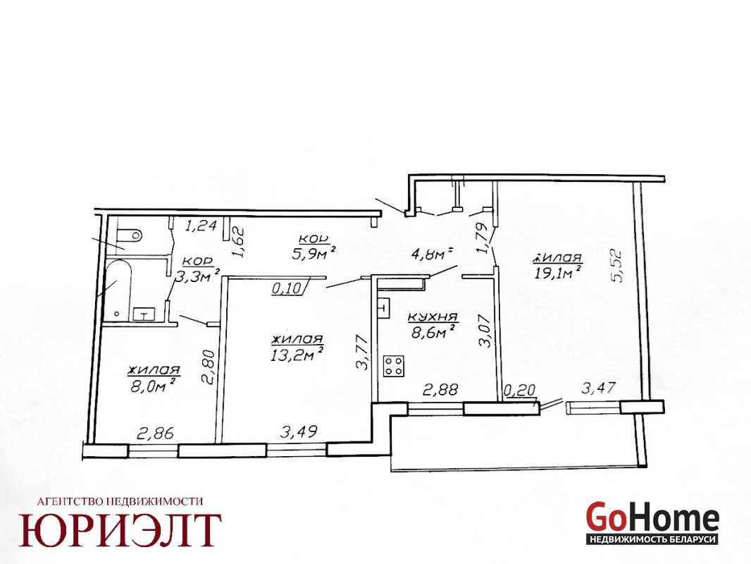 Общая площадь 67.3 м.кв. без учета лоджии, жилая 40.3 м.кв., кухня 8.6 м.кв.