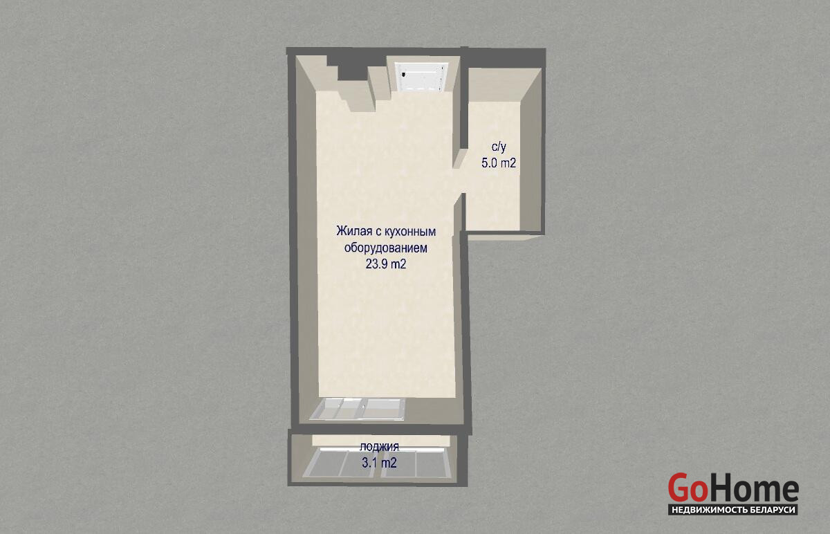 Студия с эргономичной планировкой в современном и перспективном районе г. Минска. Общая площадь – 28.9 м.кв. (по СНБ 31.1 м. кв.), жилая 23.9 м. кв.