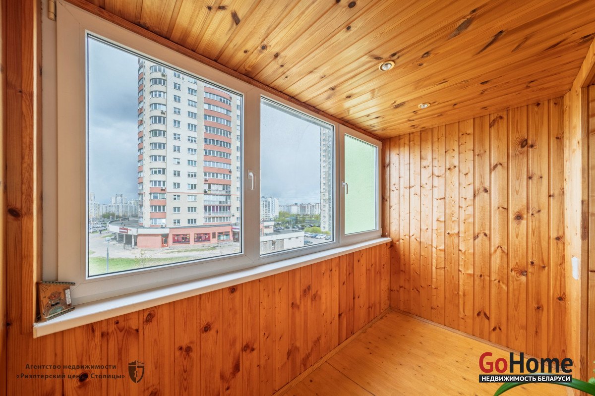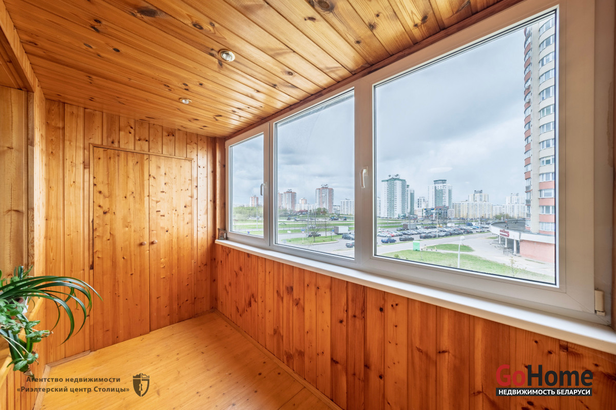 Застеклённая лоджия, обшитая вагонкой, много зон хранения.