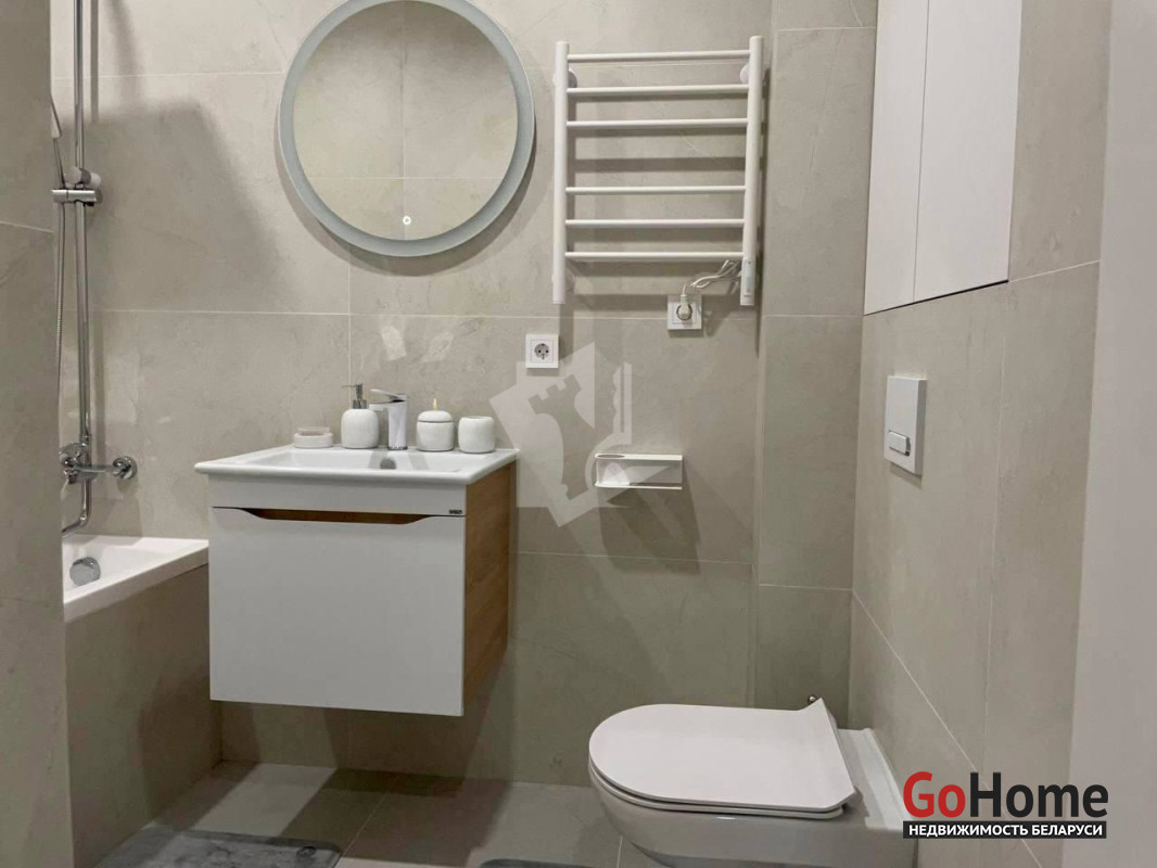 -В ванной комнате присутствует ванна, зеркало с подсветкой, подвесной унитаз, электрический полотенцесушитель, подвесной умывальник с местом хранения.