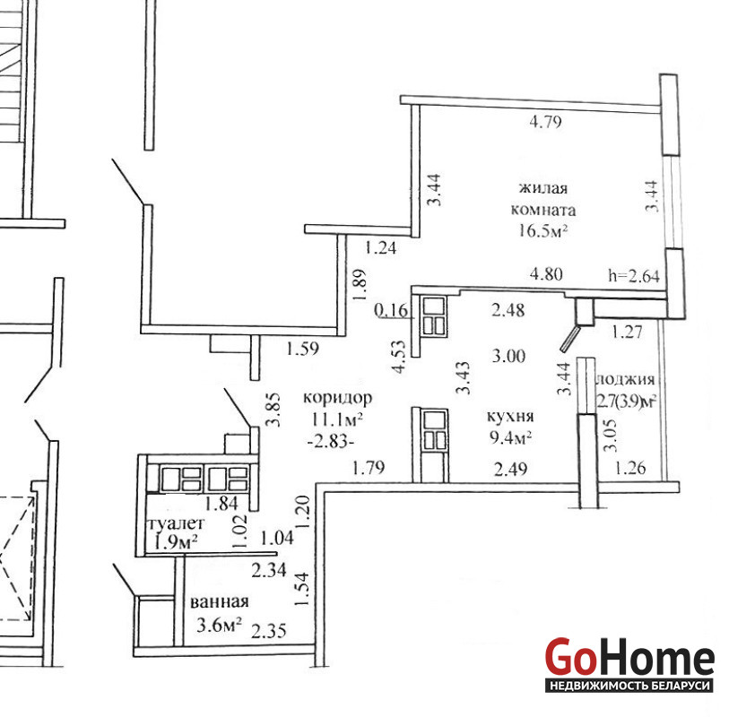 Параметры квартиры: общая площадь- 45,8 кв м, жилая площадь- 16,5 кв м, кухня- 9,4 кв м.