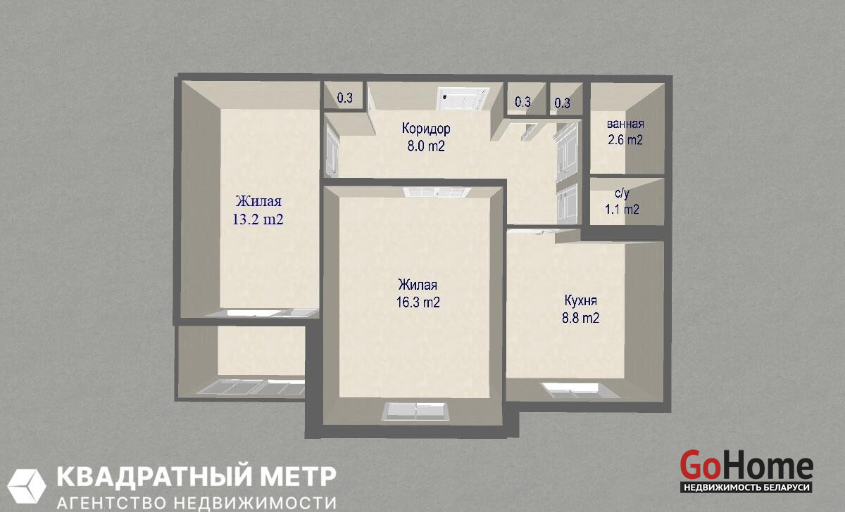 Жилая площадь - 29,5 м. кв. Комната 16,3 м. кв. и 13,2 м. кв. Площадь кухни 8,8 м. кв. Достаточно места для дружной семьи!