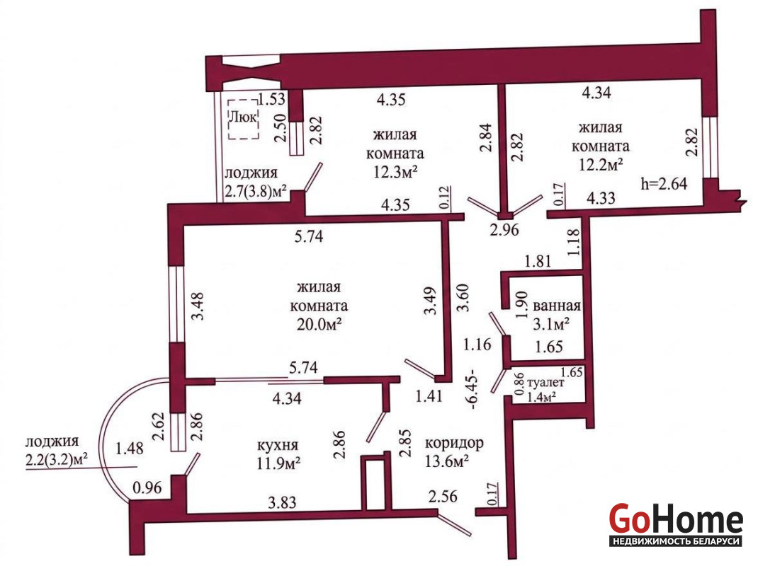 Общая площадь по СНБ - 79,4 кв.м., общая площадь – 74,5 кв. м., жилая – 44,5 кв. м., кухня – 11,9 кв. м. Высота потолка 2.64м.