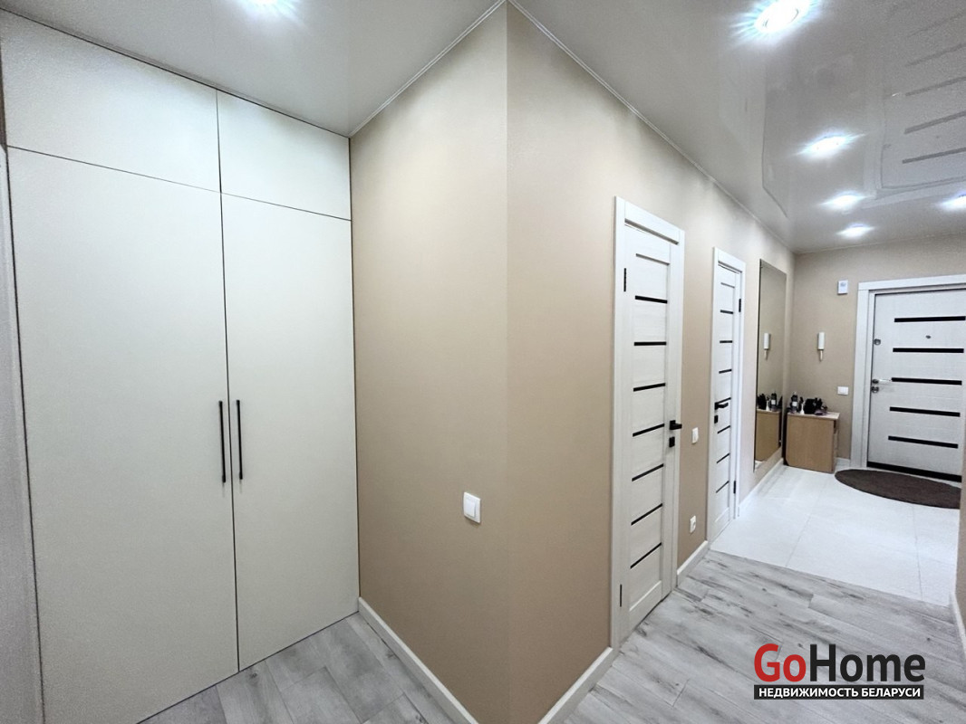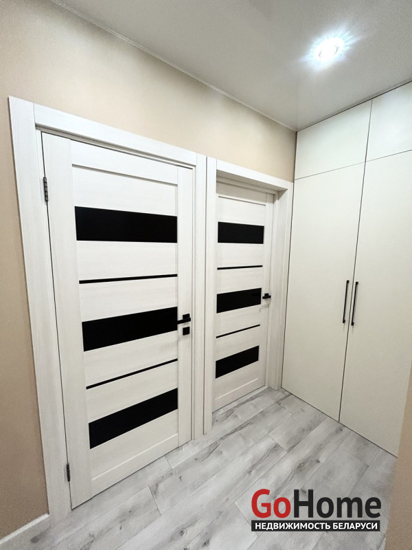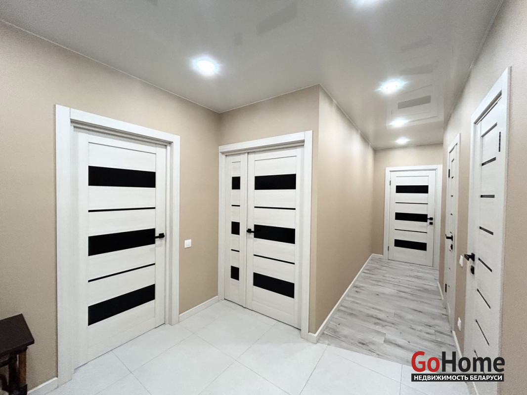 Пол в квартире – ламинат, в прихожей и кухне - керамогранит. Потолки в прихожей, коридоре, санузле и ванной – натяжные, в других помещениях – окрашены. Стены – оклеены обоями, в кухне нанесена декоративная штука. Санузел раздельный, облицован плиткой. Окна – стеклопакеты ПВХ. Металлическая входная дверь, межкомнатные двери в одном стиле.