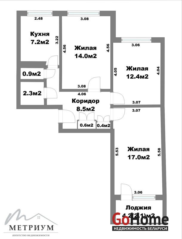 Стандартная планировка: кухня 7,2 кв.м., 3 раздельные комнаты, большая застекленная лоджия.