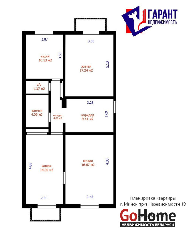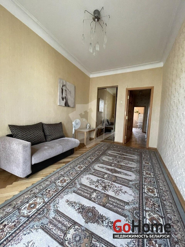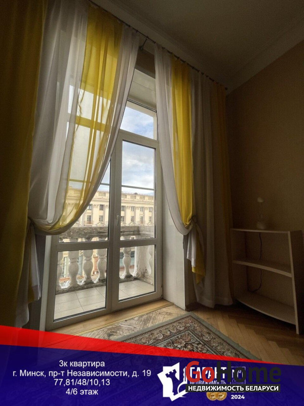 Адрес: г. Минск, проспект Независимости, д. 19 Этаж: 4 из 6 Площадь: общая 77,81 м2 / жилая 48 м2 / кухня 10,13 м2 Санузел: раздельный Окна: выходят на обе стороны – во двор и на проспект