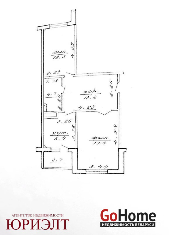 Общая площадь 55.6 м.кв., жилая 29.3 м.кв., кухня 8.4 м.кв.