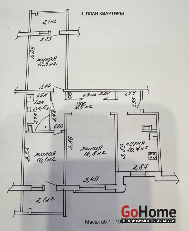 Общая площадь квартиры составляет 66 квадратных метров, из которых 39,2 квадратных метра отведено под жилые комнаты. Просторная кухня площадью 10,7 квадратных метров.