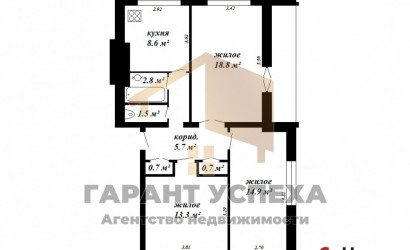 3-комнатная, 69.4/47/8.6 м2, Этаж 2 из 2, 1979 г.